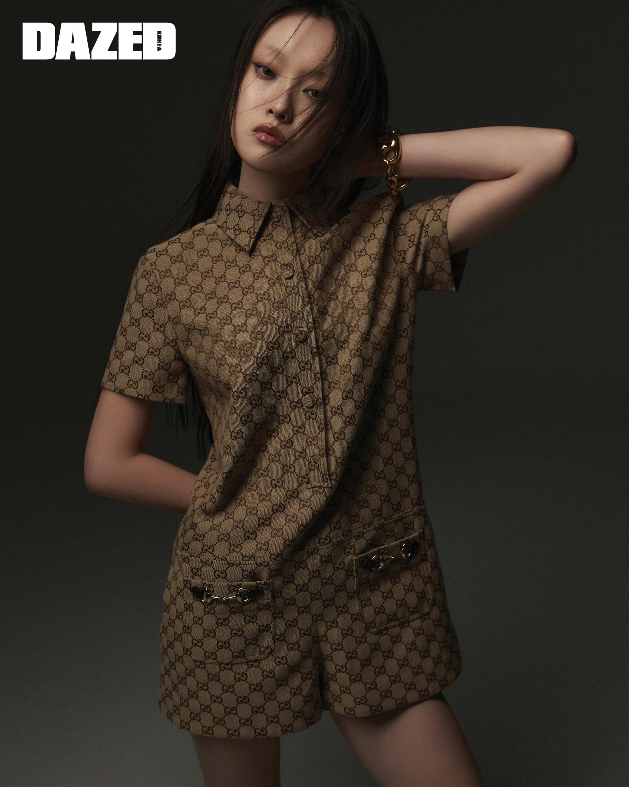 포켓 디테일의 GG 캔버스 점프슈트와 마리나 체인 디테일의 골드 피니시 메탈 브레이슬릿은 구찌(Gucci).