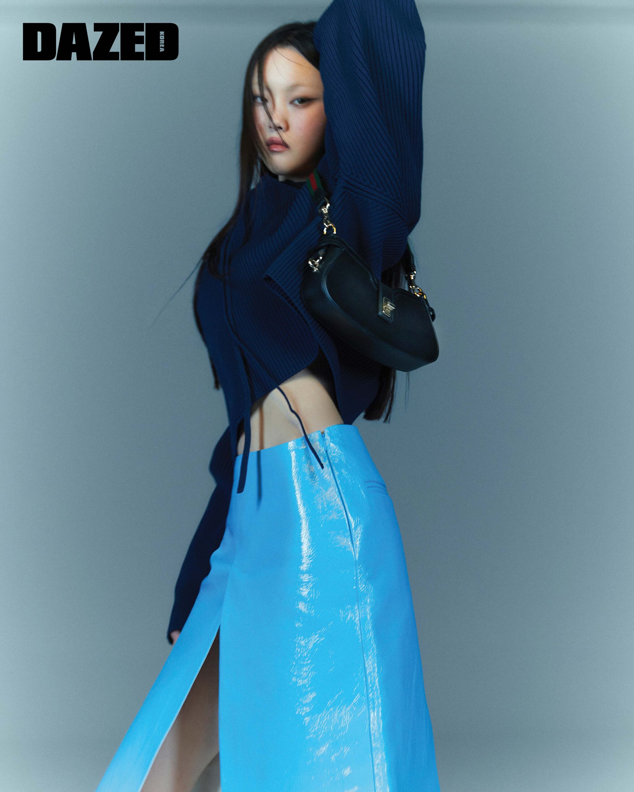 네이비 블루 리본 디테일의 니트 톱과 슬릿 디테일의 샤이니 레더 미디스커트, 블랙 레더 미니 숄더백은 모두 구찌(Gucci).
