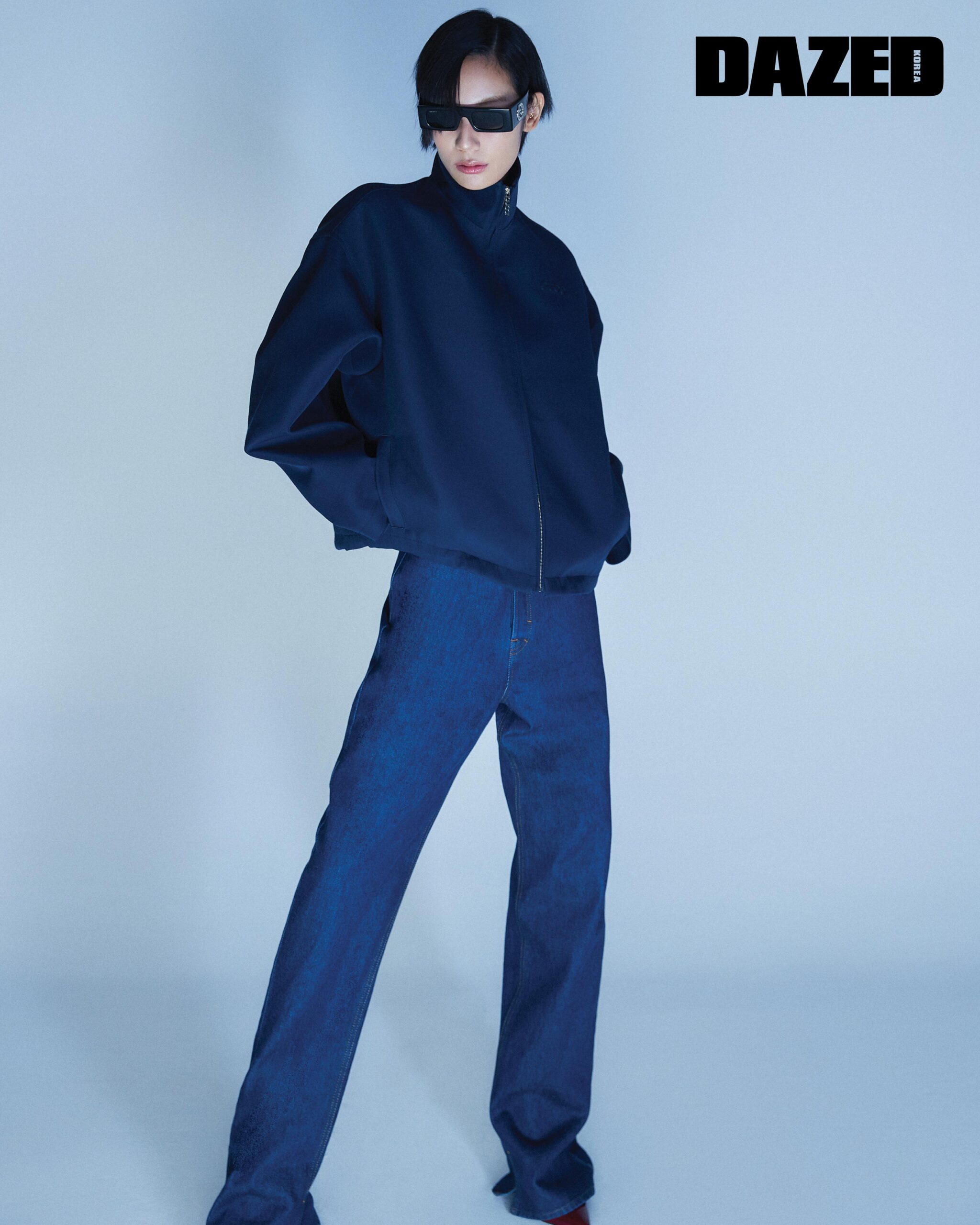 네이비 블루 드로스트링 디테일의 하이넥 재킷과 다크 블루 로웨이스트 데님 팬츠, 체인 디테일의 레드 페이턴트 레더 슬링백 펌프스, 블랙 선글라스는 모두 구찌(Gucci).