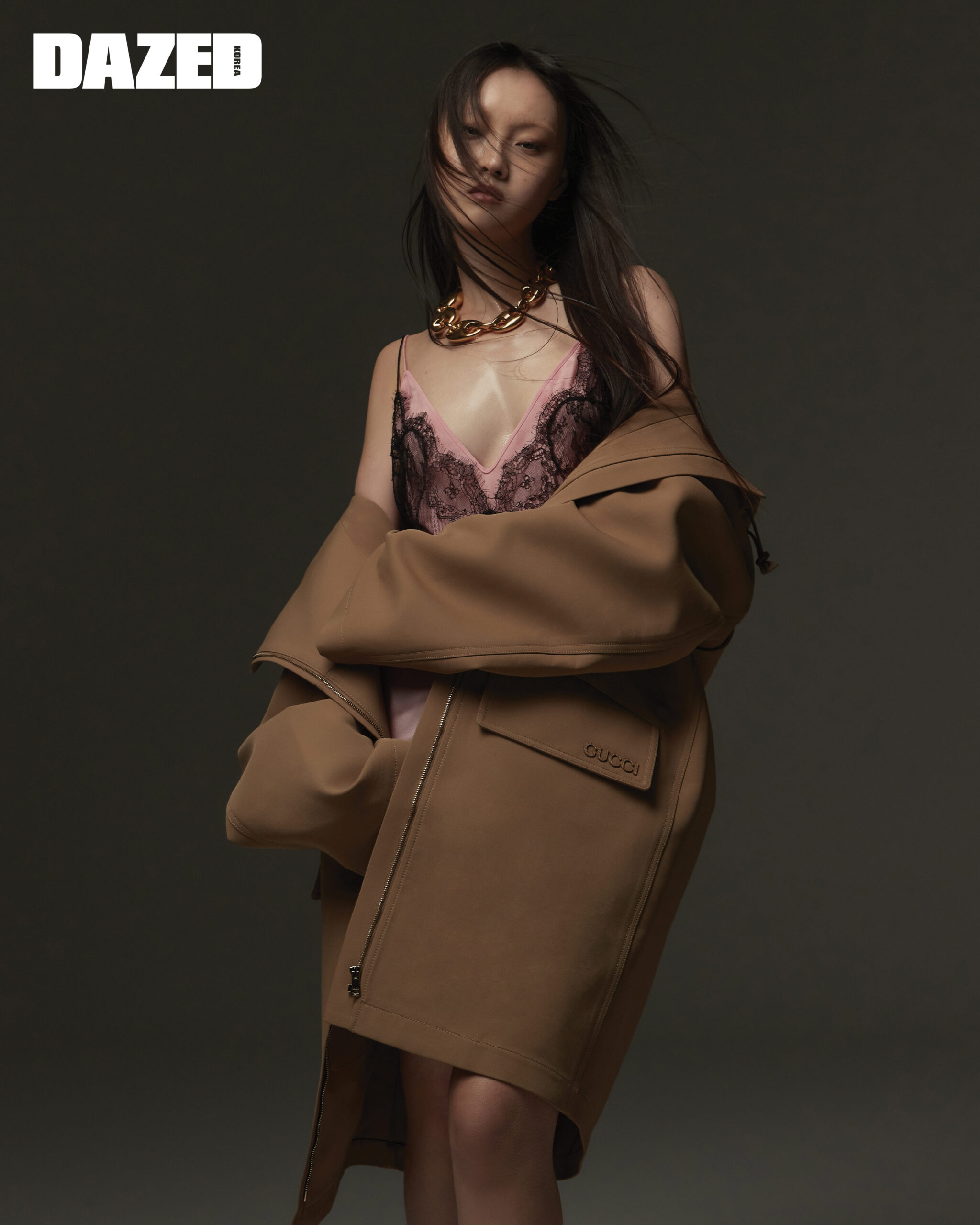엠브로이더리 디테일의 미디엄 그레이 멜란지 더블브레스트 울 테일러링 롱 코트와 구찌 스크립트 캐시미어 실크 탱크톱, 마리나 체인 디테일의 골드 피니시메탈 네크리스, G 모티브 디테일의 골드 피니시 메탈 이어링은 모두 구찌(Gucci).