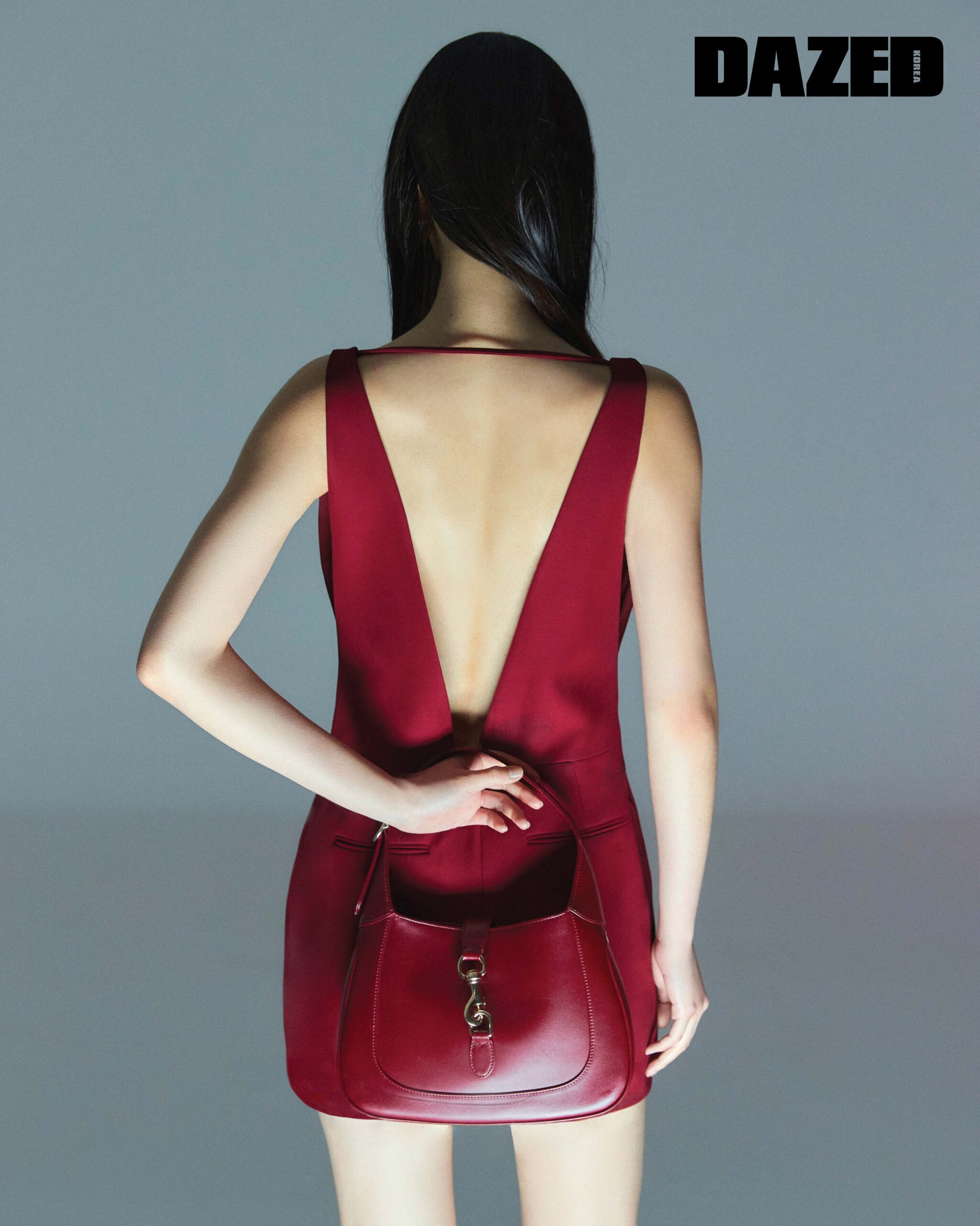 라이트 그레이 실크 울 스웨트셔츠와 슬릿 디테일의 올오버 GG 엠보스 로소 앙코라 레더 미디스커트, 체인 디테일의 레드 페이턴트 레더 슬링백 펌프스, 마리나 체인 디테일의 골드 피니시 메탈 이어링, 블랙 페이턴트 레더 스몰 톱 핸들 백은 모두 구찌(Gucci).