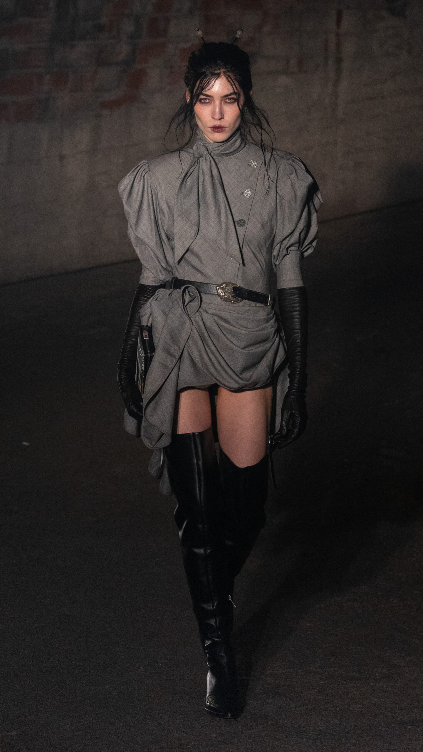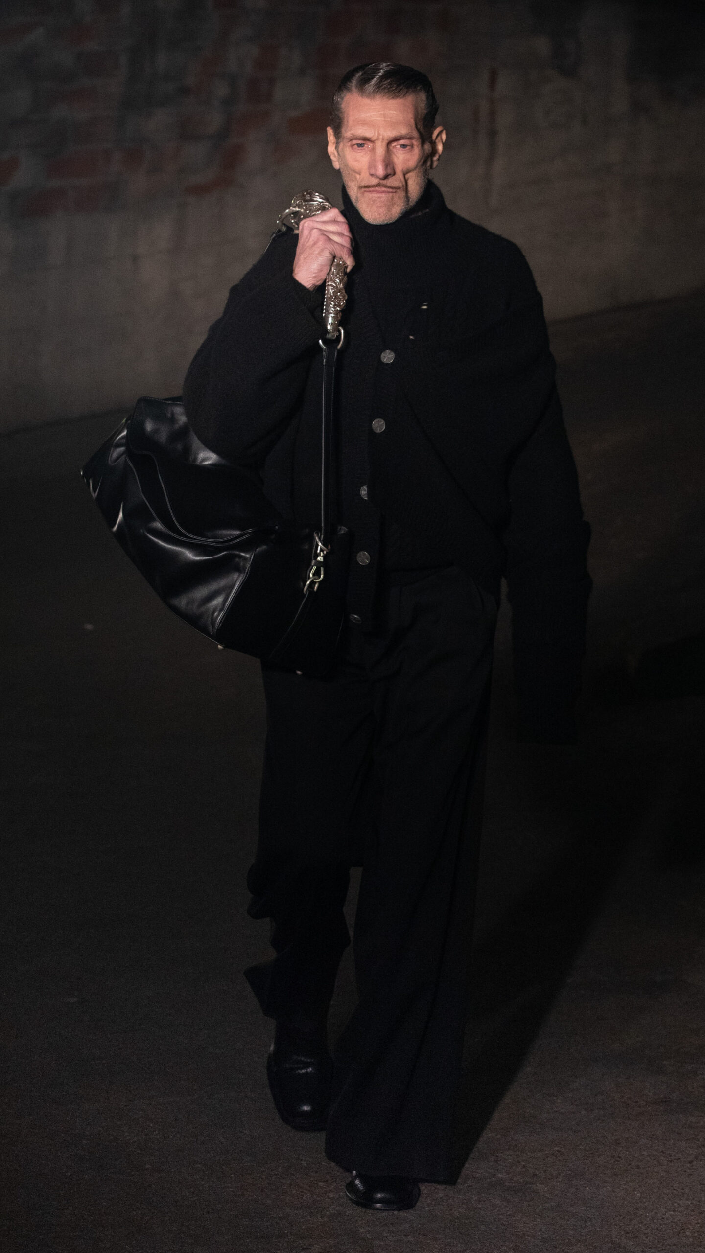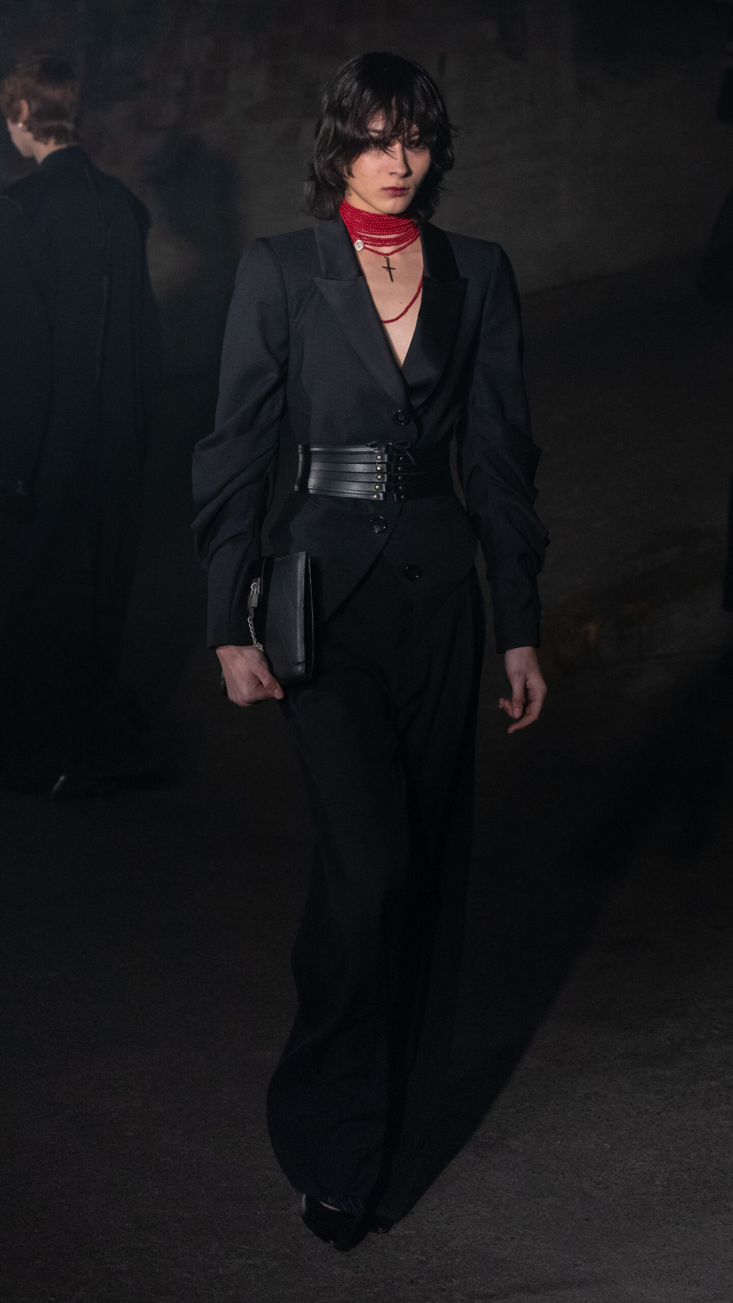 유연한 울과 캐시미어 위로 더해진 벨벳과 태피스트리 기법의 직조, 여기에 볼드한 실버 주얼리까지. 소의 피를 연상케 하는 거무칙칙한 옥스블러드 레드, 블랙 그리고 짙은 회색의 컬러팔레트가 과잉으로 가득 찬 방탕한 시대를 재현한다. 관능 위로 거친 요소들이 뒤엉킨다.