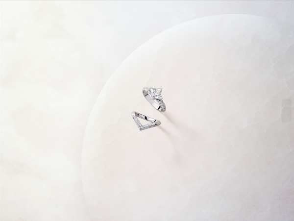 LV 다이아몬드 브이 링은 1920년대와 1930년대 가스통-루이 비통Gaston-Louis Vuitton이 디자인한 아르 데코 스타일의 V를 연상시킨다. 링의 베젤 부분에 모노그램 플라워가 자리하고, 4개의 작은 V 모양의 갈고리들이 이 특별한 다이아몬드의 곡선과 가장자리를 감싼다.
