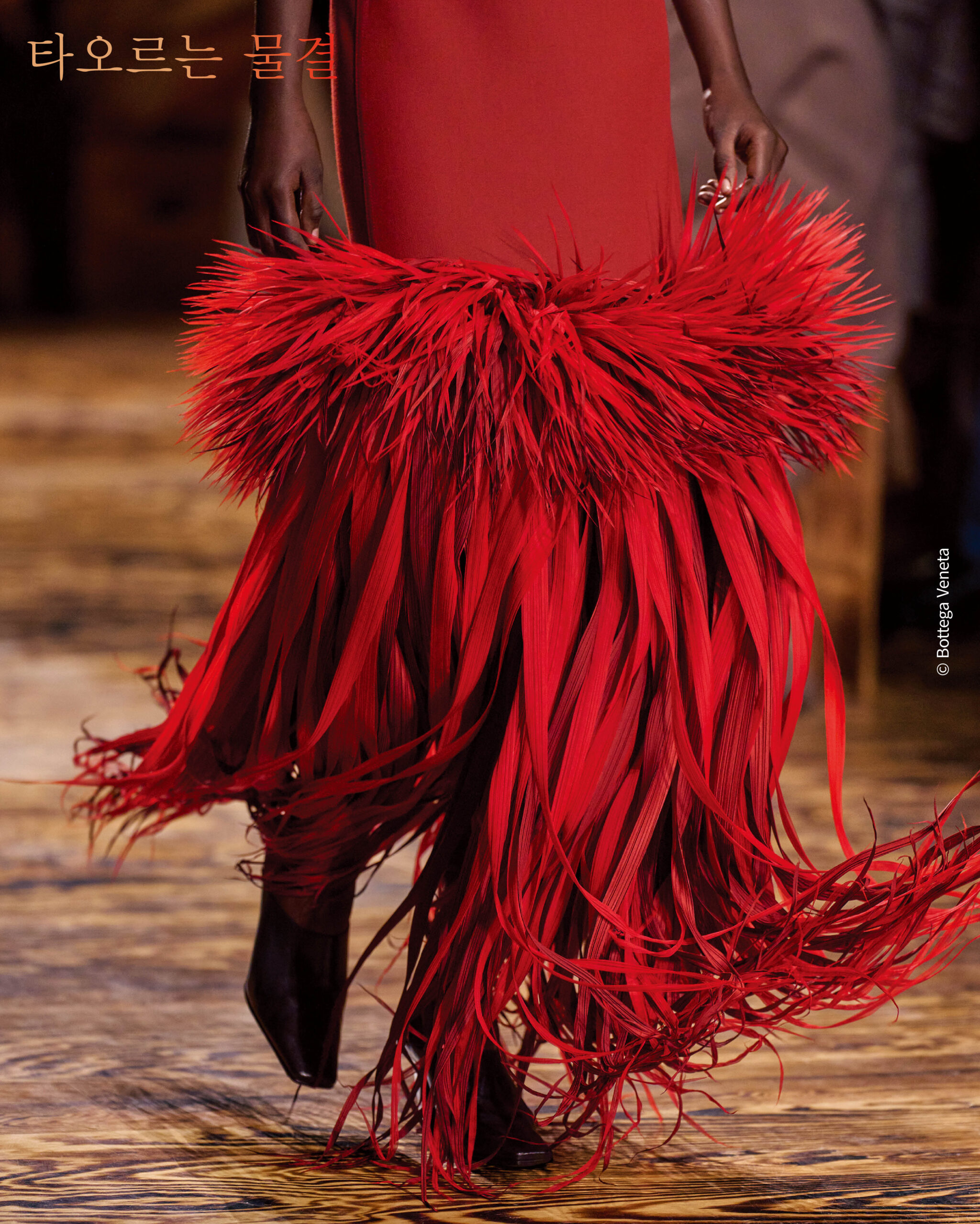 마티유 블라지의 보테가 베네타가 지나온 흔적을 다시 걷기로 한다. 데뷔 시즌부터 3부작에 걸쳐 이탈리아를 향한 헌사를 담아내더니, 직전 시즌엔 원초적 세계로의 여행에 몸을 싣는다. 생각해 보면 모든 여정에 늘 자연이 함께했다. 그는 인간이 동물과 광물과 식물 같은 원초적 자연 세계와 다시 긴밀하게 연결되어야 한다고 옷과 말로 줄곧 주장하고 증명했다. 자연의 경이로움을 인정하는 건 규칙에 얽매이지 않는 옷을 만들 수 있는 자유로운 힘이 된다는 말과 함께.