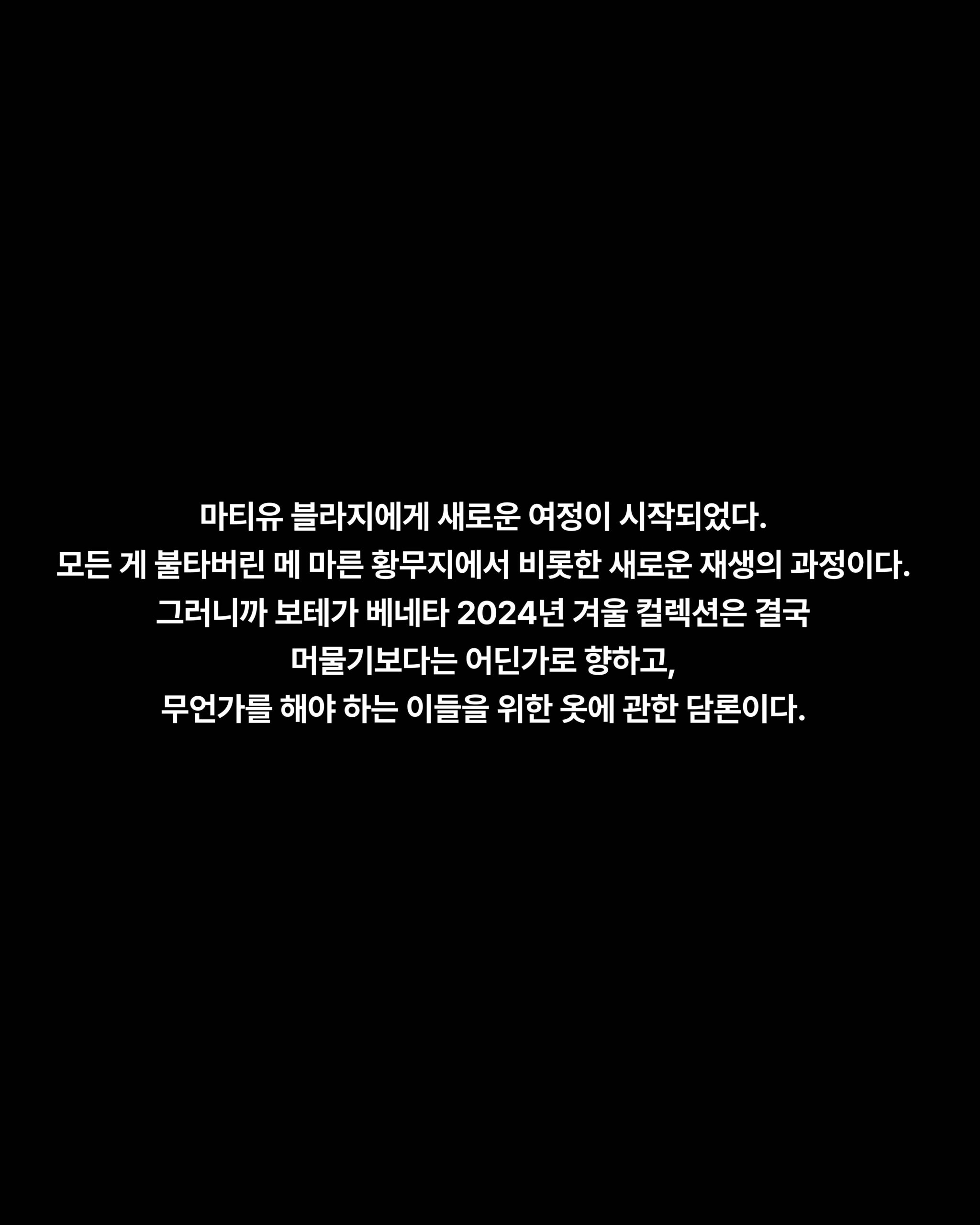 마티유 블라지에게 새로운 여정이 시작되었다. 모든 게 불타버린 메마른 황무지에서 비롯한 새로운 재생의 과정이다. 그러니까 보테가 베네타 2024년 겨울 컬렉션은 결국 머물기보다는 어딘가로 향하고, 무언가를 해야하는 이들을 위한 옷에 관한 담론이다.