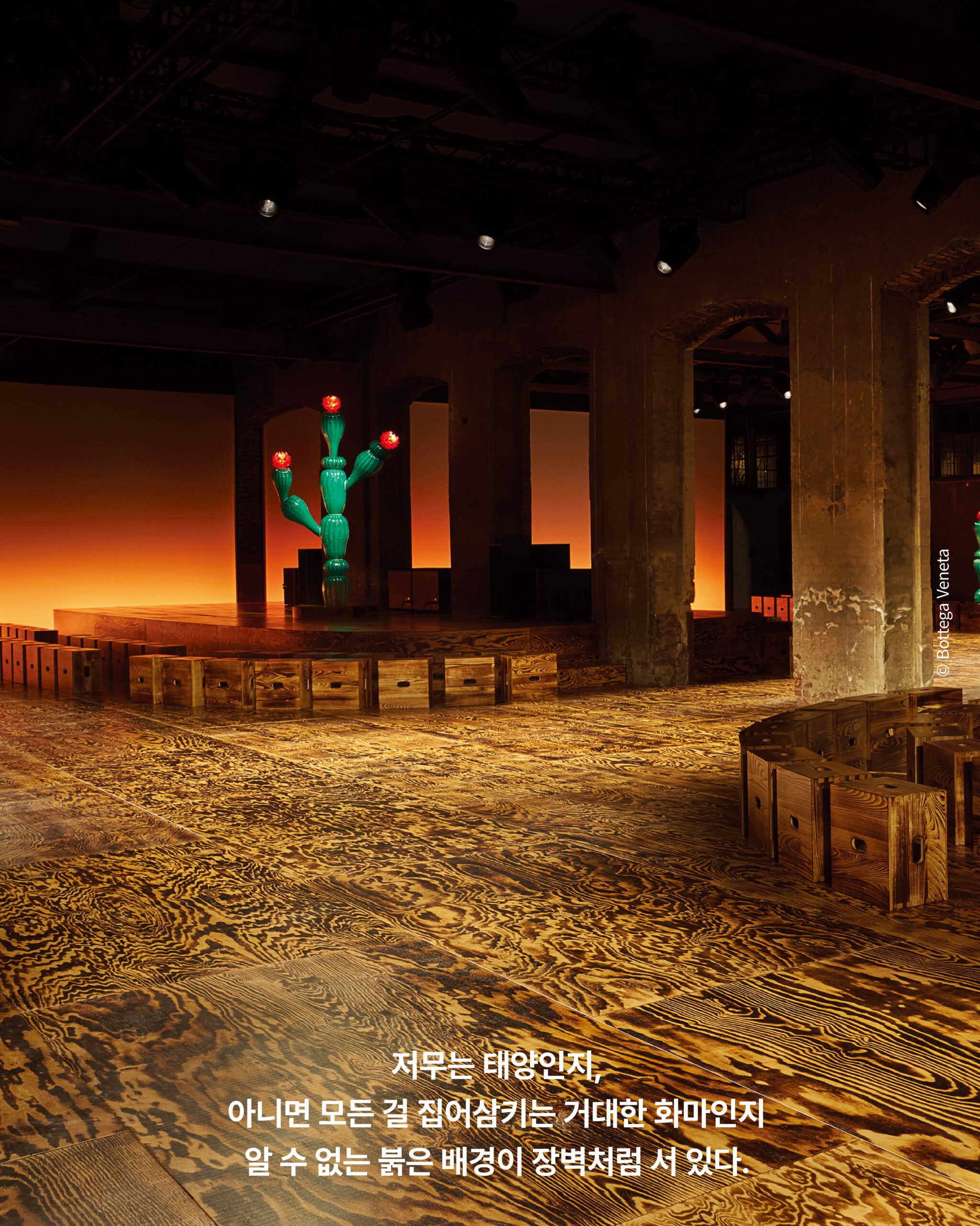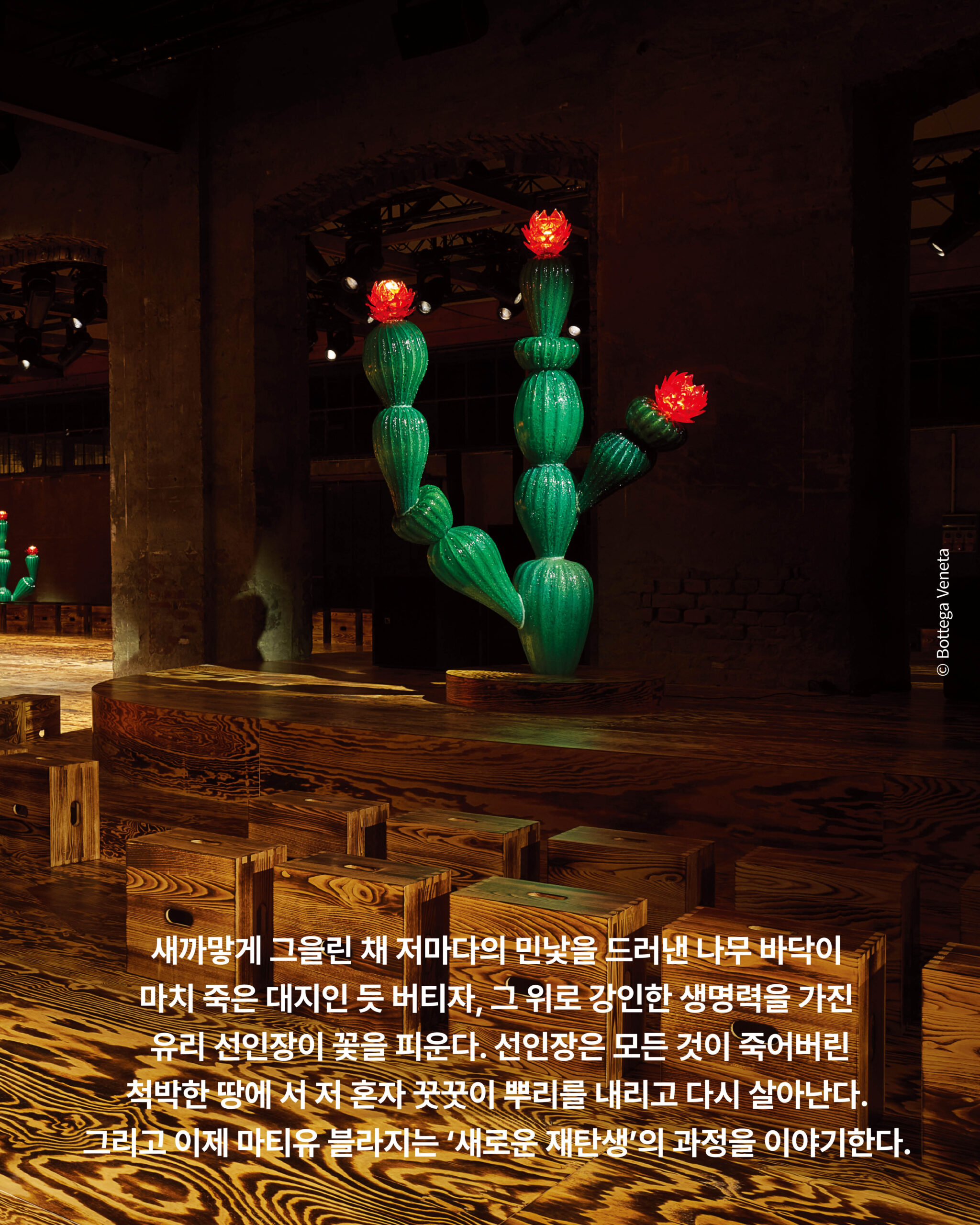 긍정의 힘보다는 우울과 혐오와 염세주의에 중독되기 쉬운 세상. 그는 여전히 가끔 보이는 낮의 햇살과 푸른 하늘이 주는 옅은 희망의 색채를 옷에 담는다. 회복과 부활을 상징하는 꽃과 뱀과 불꽃의 모티브를 반복해 사용 하는 이유도 그 때문이다. 쇼의 말미, 붉은빛을 뚫고 무대 뒤에서 돌진하듯 달려 나오는 마티유 블라지가 두 손을 공손하게 모아 고개를 숙여 인사를 할 때, 그가 지닌 선한 우아함의 근원을 조용히 추측해 볼 따름이었다. 그리고 새삼 그런 생각이 스쳤다. 마티유 블라지는 디자이너이기도 하지만 진지한 사상가이자 스토리텔러가 아닐까. 쇼장에 서 있던 유리 선인장은 베네치아 무라노섬의 유리 장인들이 손수 만든 것이다. 쇼가 끝난 직후 밀란의 작은 호텔 방에 앉아 구글맵을 열어 그곳에 닿는 길을 헤아리다가 말았다.