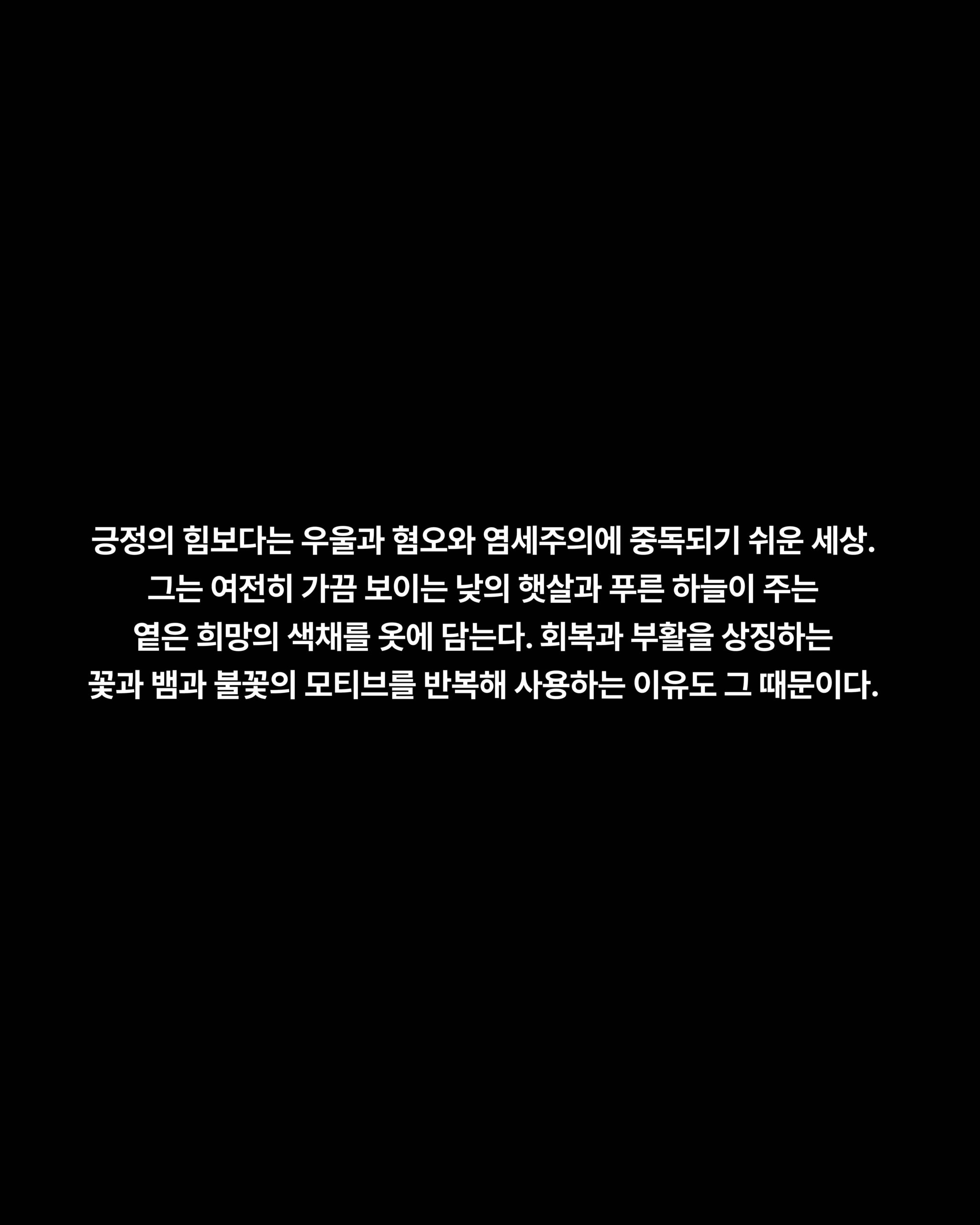 저무는 태양인지, 아니면 모든 걸 집어삼키는 거대한 화마인지 알 수 없는 붉은 배경이 장벽처럼 서 있다. 새까맣게 그을린 채 저마다의 민낯을 드러낸 나무 바닥이 마치 죽은 대지인 듯 버티자, 그 위로 강인한 생명력을 가 진 유리 선인장이 꽃을 피운다. 선인장은 모든 것이 죽어버린 척박한 땅에 서 저 혼자 꿋꿋이 뿌리를 내리고 다시 살아난다. 그리고 이제 마티유 블라지는 ‘새로운 재탄생’의 과정을 이야기한다. 특유의 우아한 낙관주의적 태도로 미래를 위한 새로운 시작 앞에 선 셈이다. 지금까지 그의 옷이 주로 물과 같이 흐를 줄 알았다면 지금 내 앞에 즐비한 오늘의 옷은 산처럼 묵묵히 서 있다고 여겨졌다. 지난 옷보다 수분감이 덜하다고 해야 할까. 장식적 요소나 화려한 디테일을 과감히 덜어내고 의도적으로 침착한 태도와 평정심을 유지하기. ‘심플하다’ 혹은 ‘단순하다’는 표현보다는 ‘정직하고 담백한 자신감’이라는 표현이 적합하다. 축축하게 젖어 흘러 버리는 옷보단 버티고 서 있는 옷의 힘과 생명력이 훨씬 강하다는 사실을 이제는 안다.