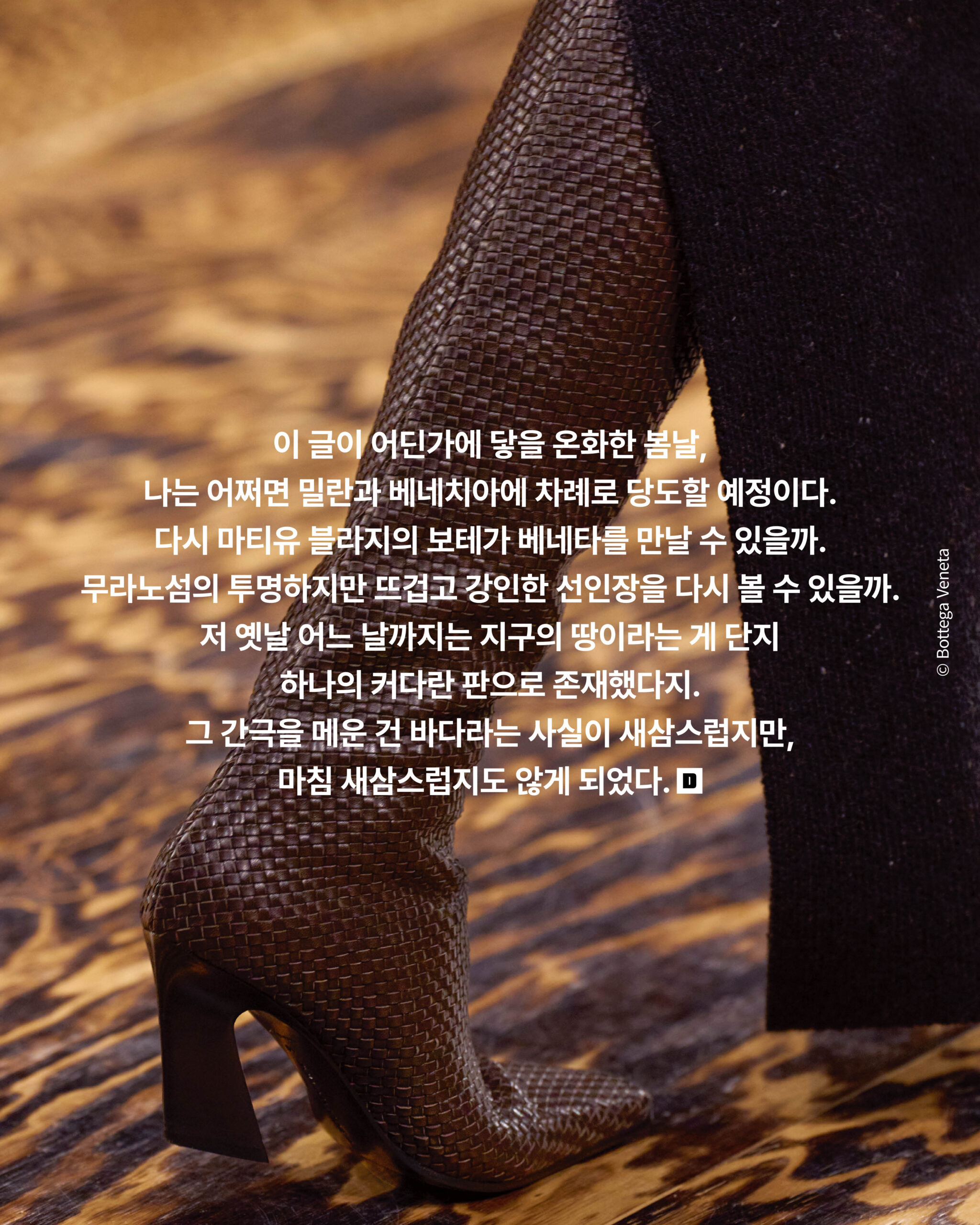 이 글이 어딘가에 닿을 온화한 봄날, 나는 어쩌면 밀란과 베네치아에 차례로 당도할 예정이다. 다시 마티유 블라지의 보테가 베네타를 만날 수 있을까. 무라노섬의 투명하지만 뜨겁고 강인한 선인장을 다시 볼 수 있을까. 저 옛날 어느 날까지는 지구의 땅이라는 게 단지 하나의 커다란 판으로 존재했다지. 그 간극을 메운 건 바다라는 사실이 새삼스럽지만, 마침 새삼스럽지도 않게 되었다.
