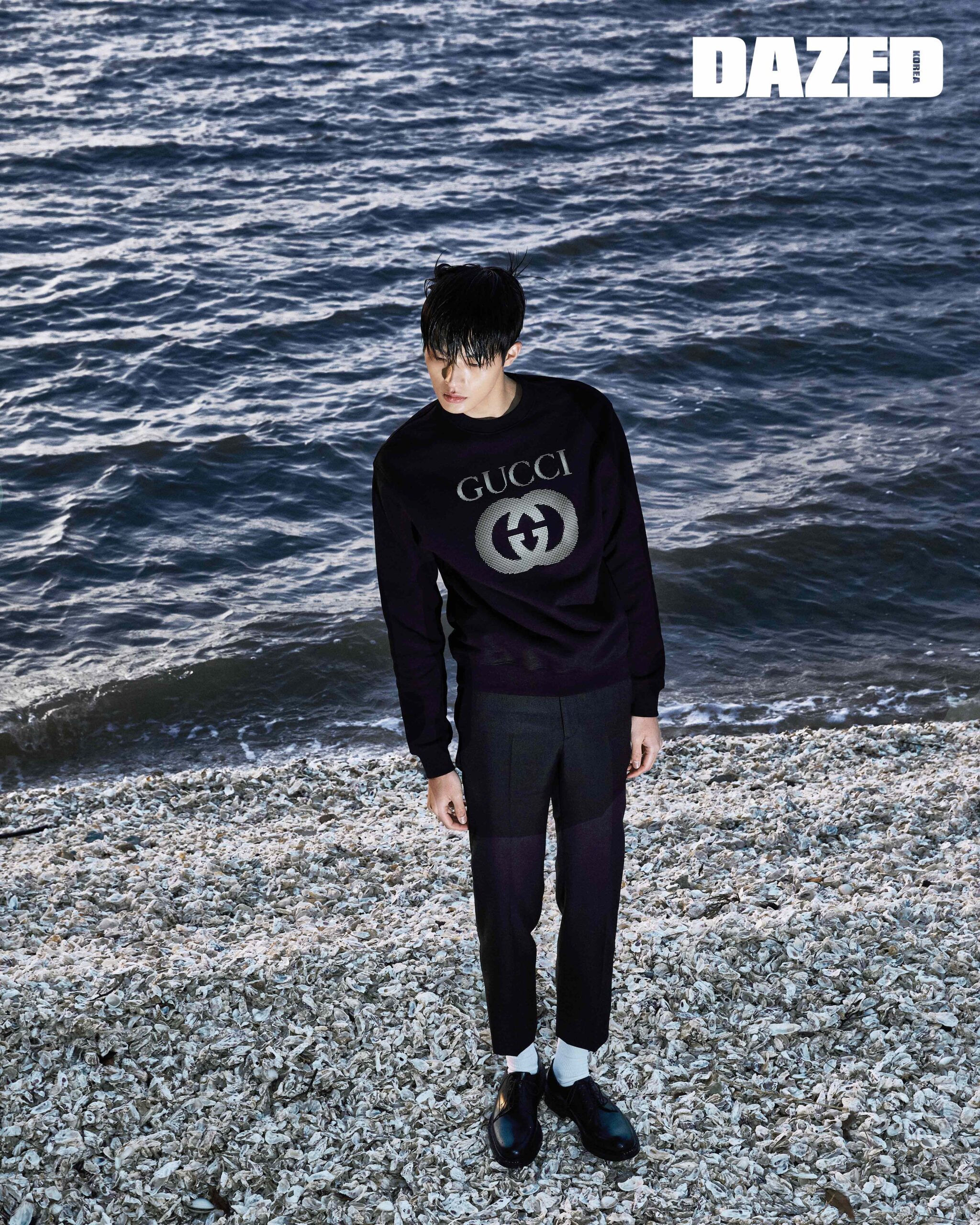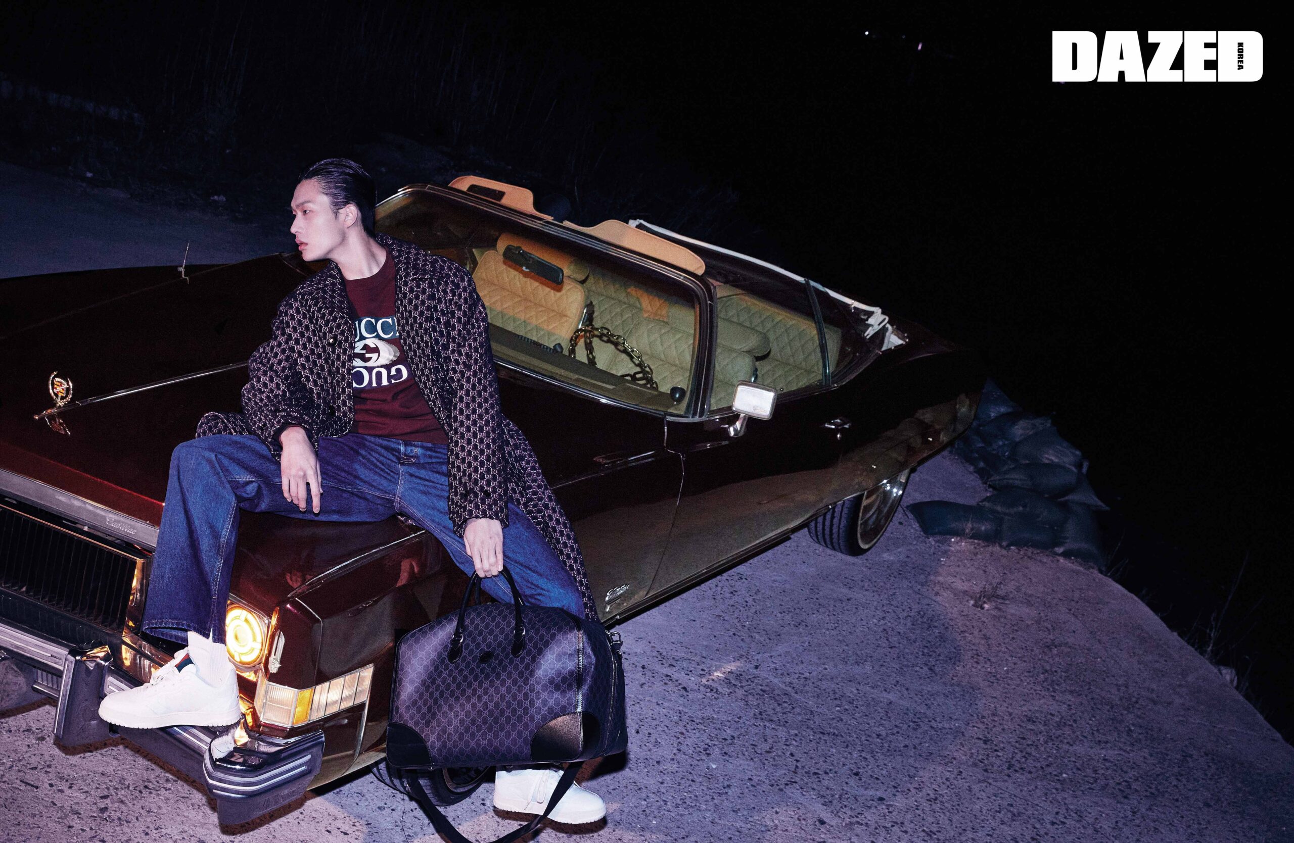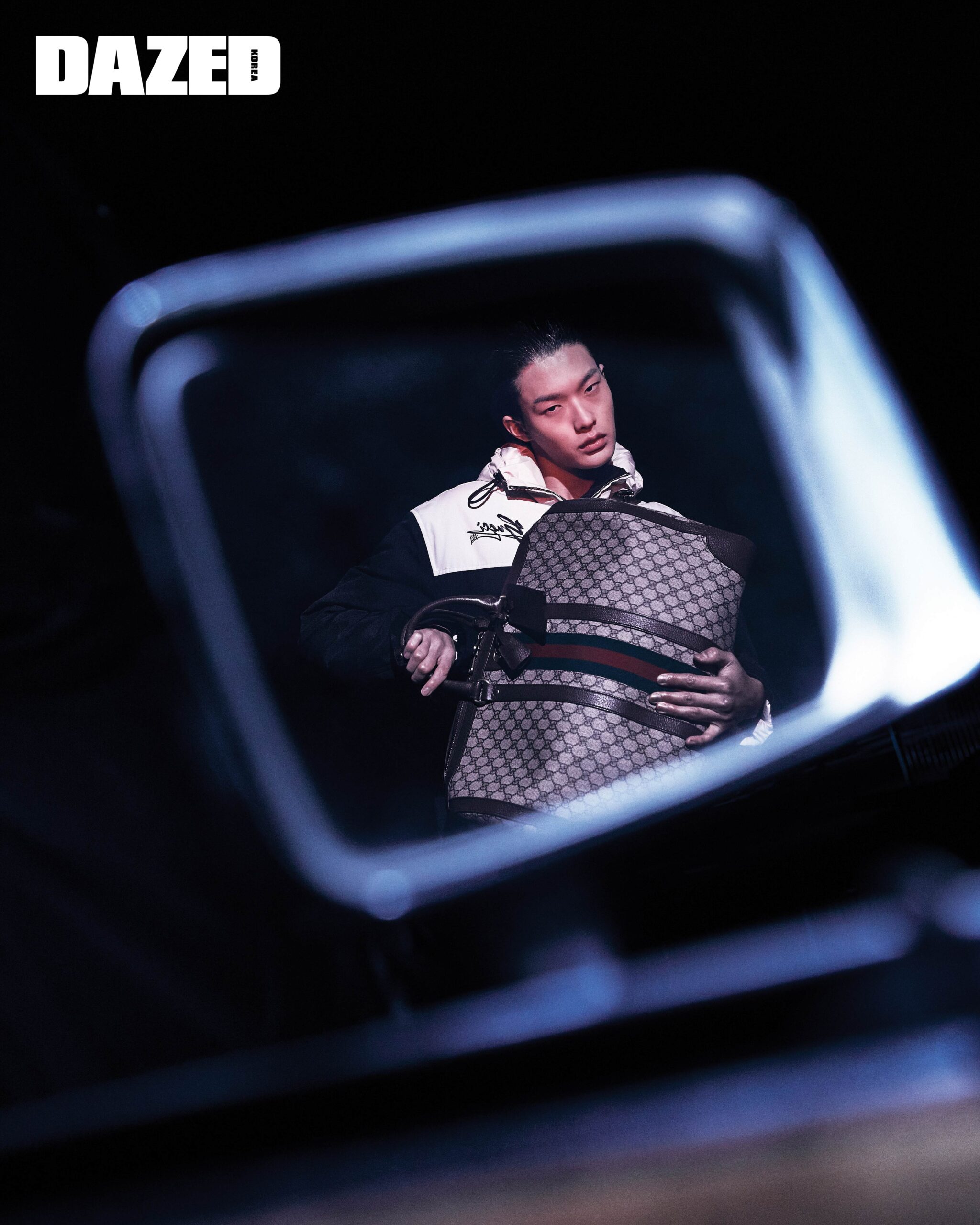 블루 멀티컬러 GG 섀도우 부클레 코트와 프린트 디테일의 로소 앙코라 멀티컬러 코튼 스웨트셔츠, 스플릿 디테일의 다크 블루 에코 워시드 오가닉 데님 팬츠, 웹 디테일의 화이트 레더 스니커즈, 웹 디테일의 화이트 코튼 삭스, 블랙 GG 수프림 캔버스 라지 더플백은 모두 구찌(Gucci).