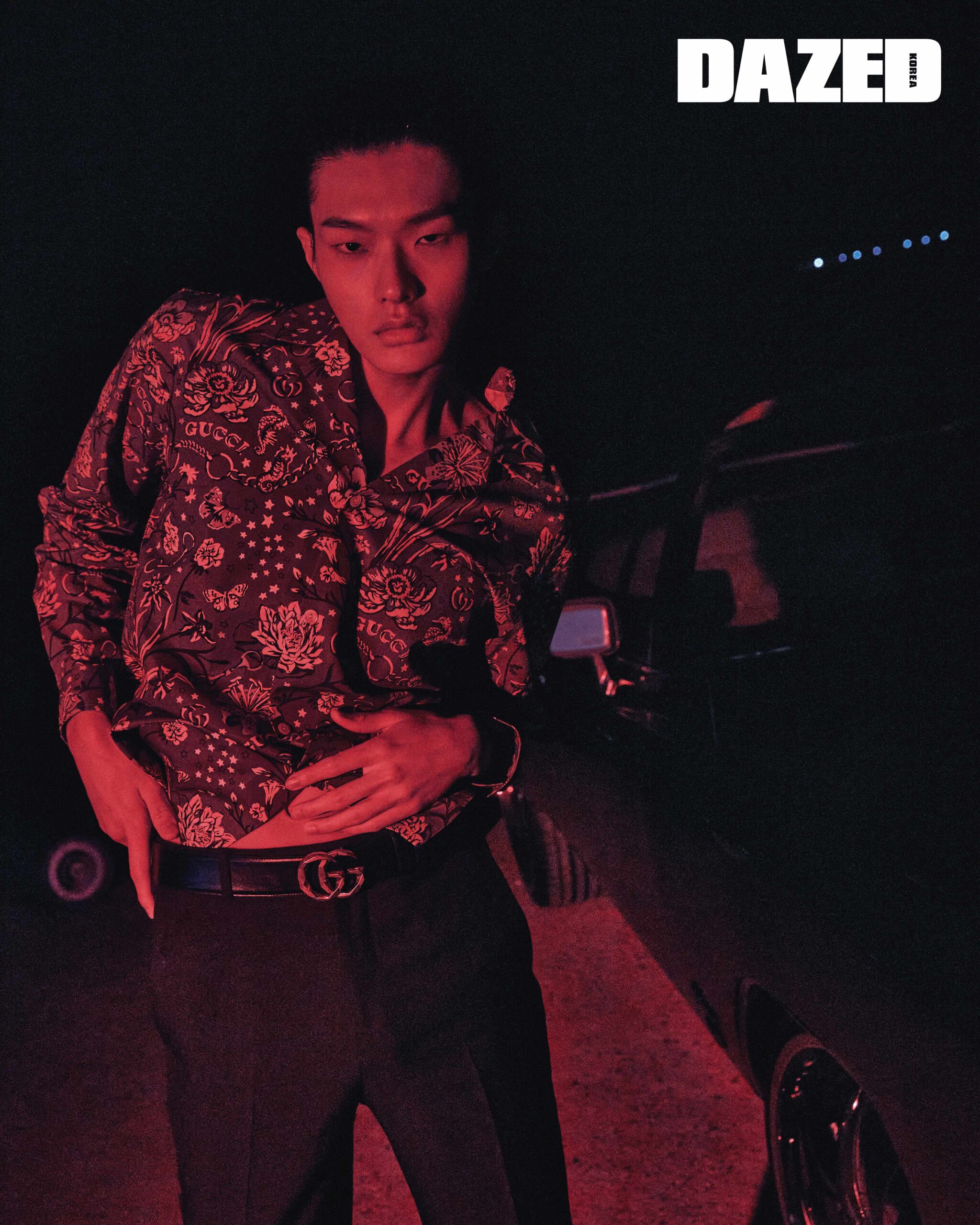 펑크필드 프린트의 스톤 마젠타 멀티컬러 셔츠와 블랙 폴리에스테르 울 70’ 트윌 팬츠, 더블 G 버클 디테일의 블랙 레더 벨트는 모두 구찌(Gucci).