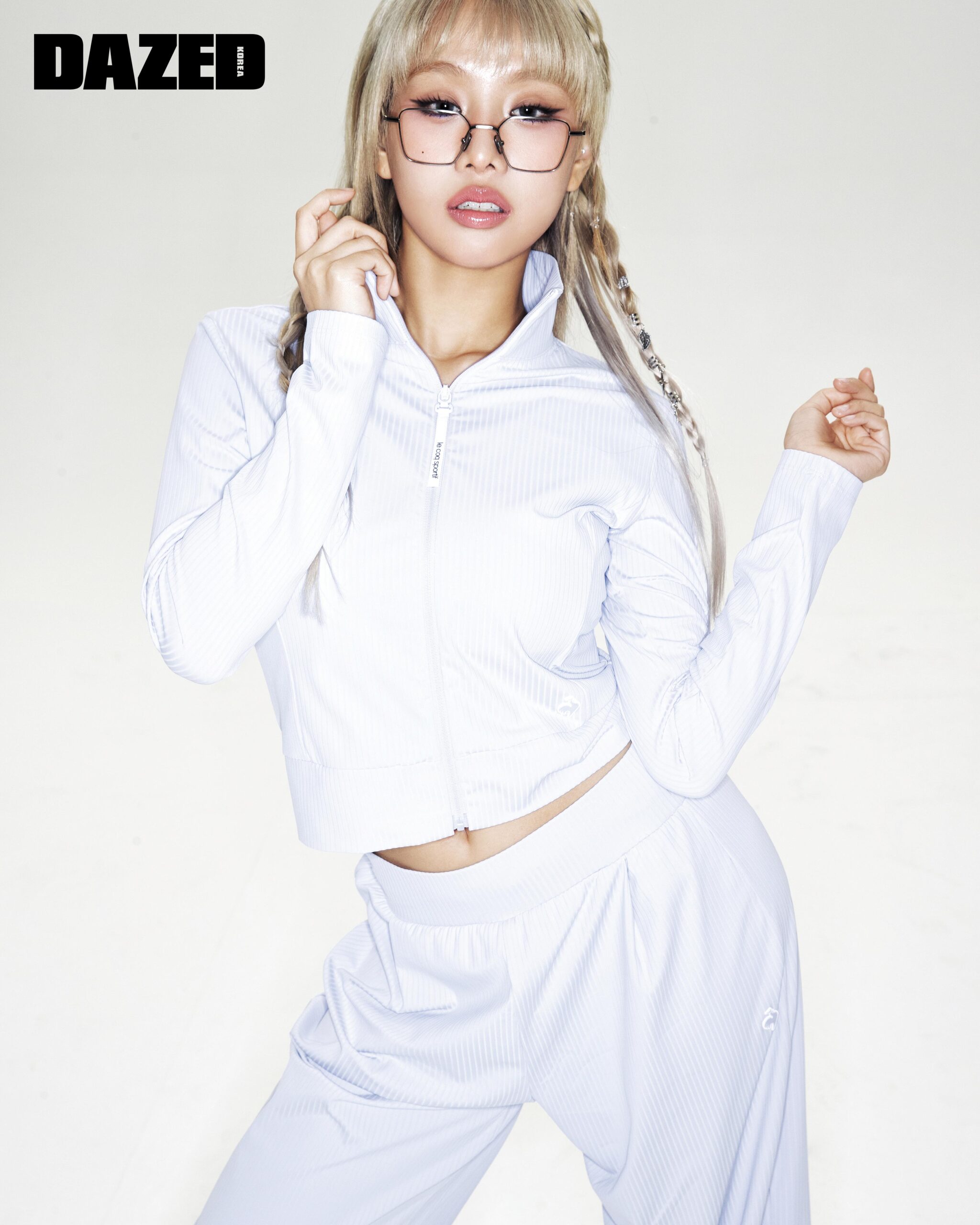 서머 자카르 소재 하프 슬리브 톱과 화이트 로고 볼캡은 르꼬끄 스포르티브(Le Coq Sportif), 이어 커프는 앵브록스(Engbrox), 실버 네크리스는 샵사이다(Shop Cider).