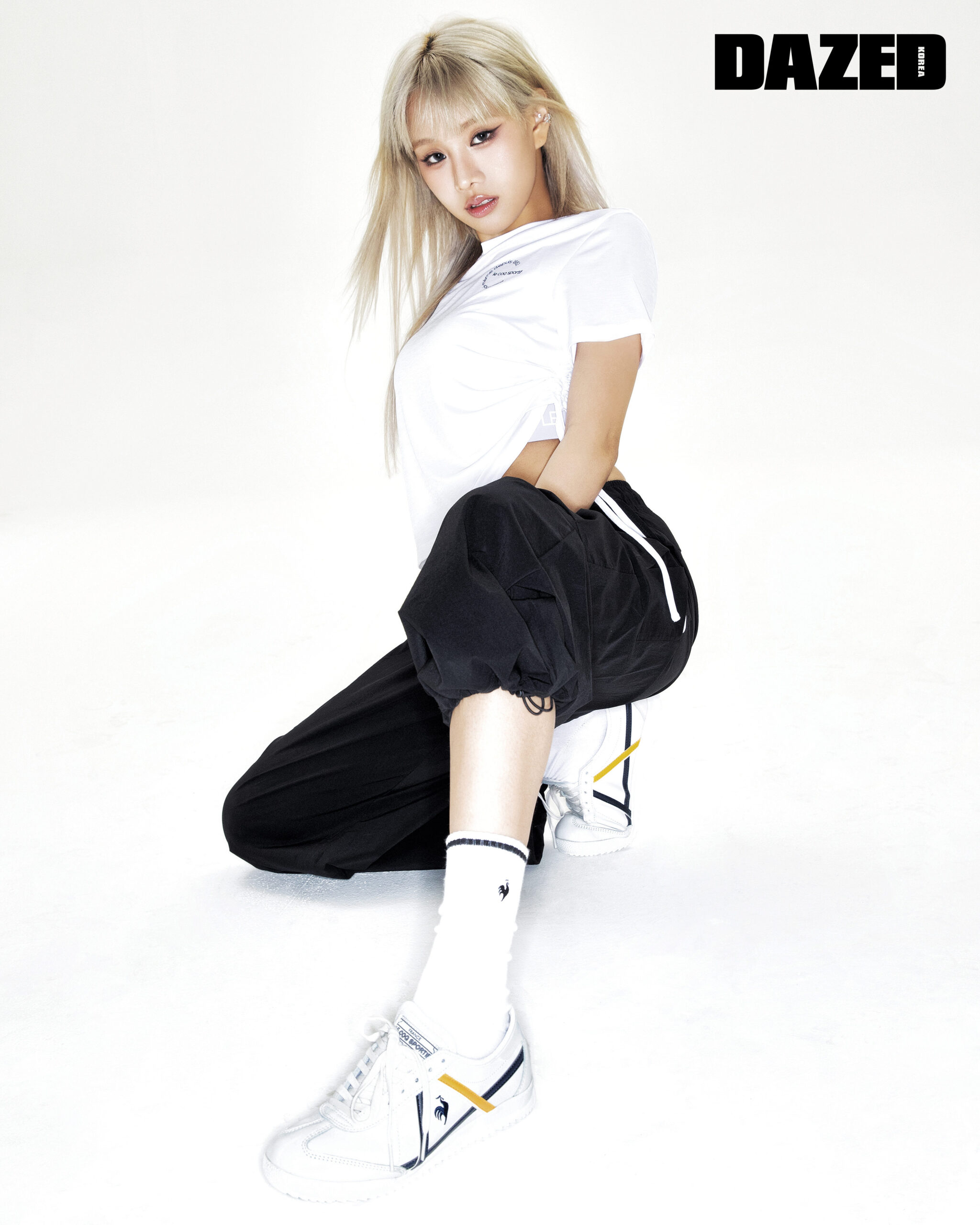 화이트 컬러 투웨이 핏 슬럽 하프 슬리브 톱과 브라톱, 블랙 쿨 코테 조거 팬츠, 로고 삭스, 슈즈는 모두 르꼬끄 스포르티브(Le Coq Sportif).