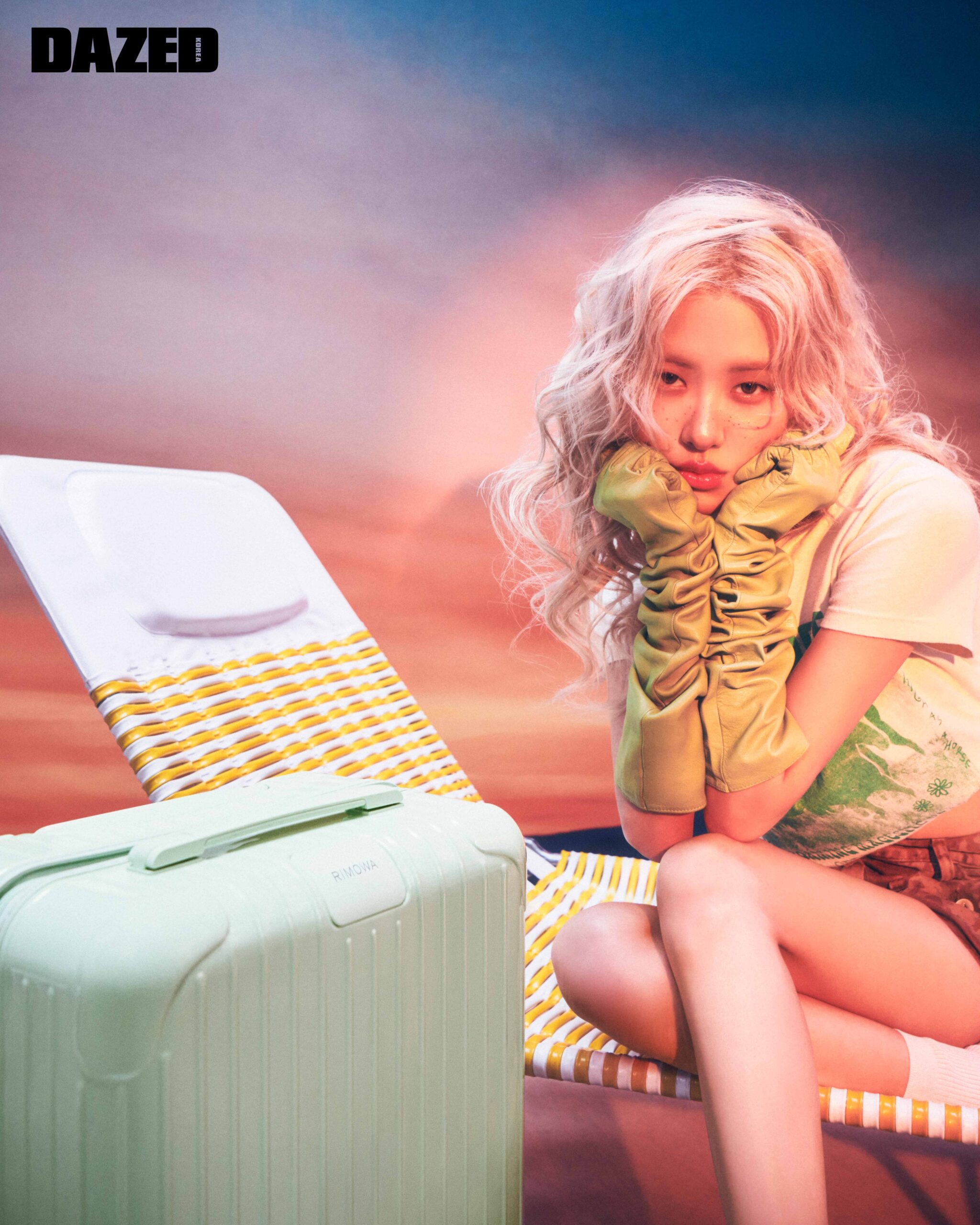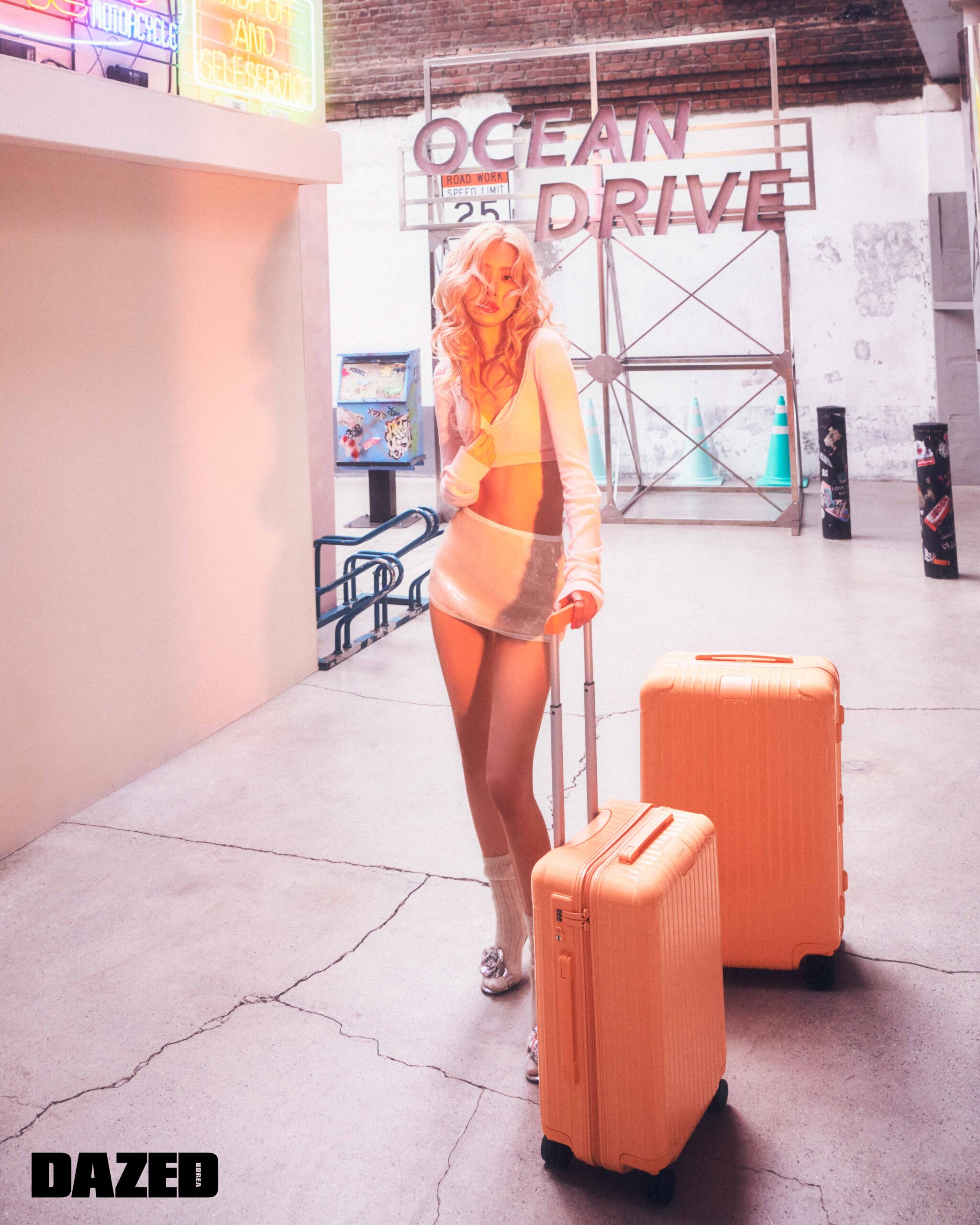 파파야 컬러의 유니크를 장착한 실버 클래식 캐빈 슈트케이스는 리모와(RIMOWA), 베이지 크롭트 후디는 사미 미로 빈티지 by 무이(Sami Miro Vintage by MUE), 도트 패턴 톱과 플리츠스커트는 마크공(Markgong), 레이스업 부츠는 막스마라(Max Mara).
