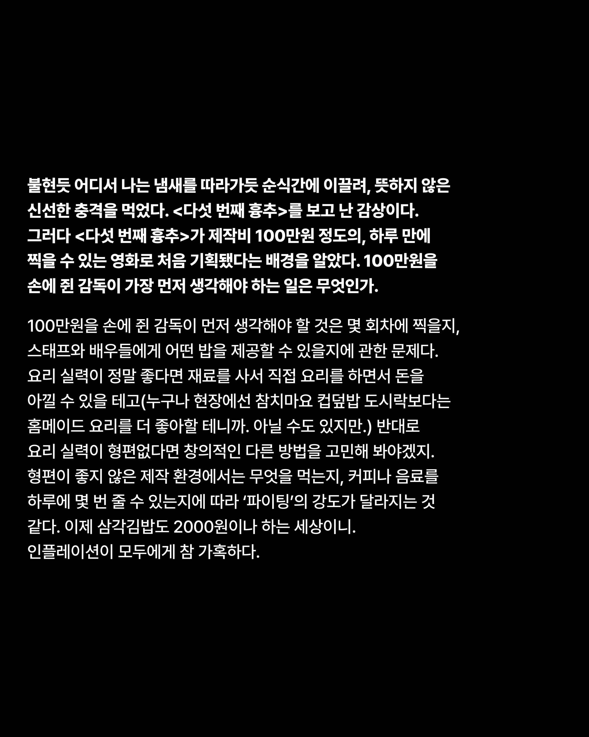 100만원을 손에 쥔 감독이 먼저 생각해야 할 것은 몇 회차에 찍을지, 스태프와 배우들에게 어떤 밥을 제공할 수 있을지에 관한 문제다. 요리 실력이 정말 좋다면 재료를 사서 직접 요리를 하면서 돈을 아낄 수 있을 테고(누구나 현장에선 참치마요 컵덮밥 도시락보다는 홈메이드 요리를 더 좋아할 테니까. 아닐 수도 있지만.) 반대로 요리 실력이 형편없다면 창의적인 다른 방법을 고민해 봐야겠지. 형편이 좋지 않은 제작 환경에서는 무엇을 먹는지, 커피나 음료를 하루에 몇 번 줄 수 있는지에 따라 ‘파이팅’의 강도가 달라지는 것 같다. 이제 삼각김밥도 2000원이나 하는 세상이니. 인플레이션이 모두에게 참 가혹하다.