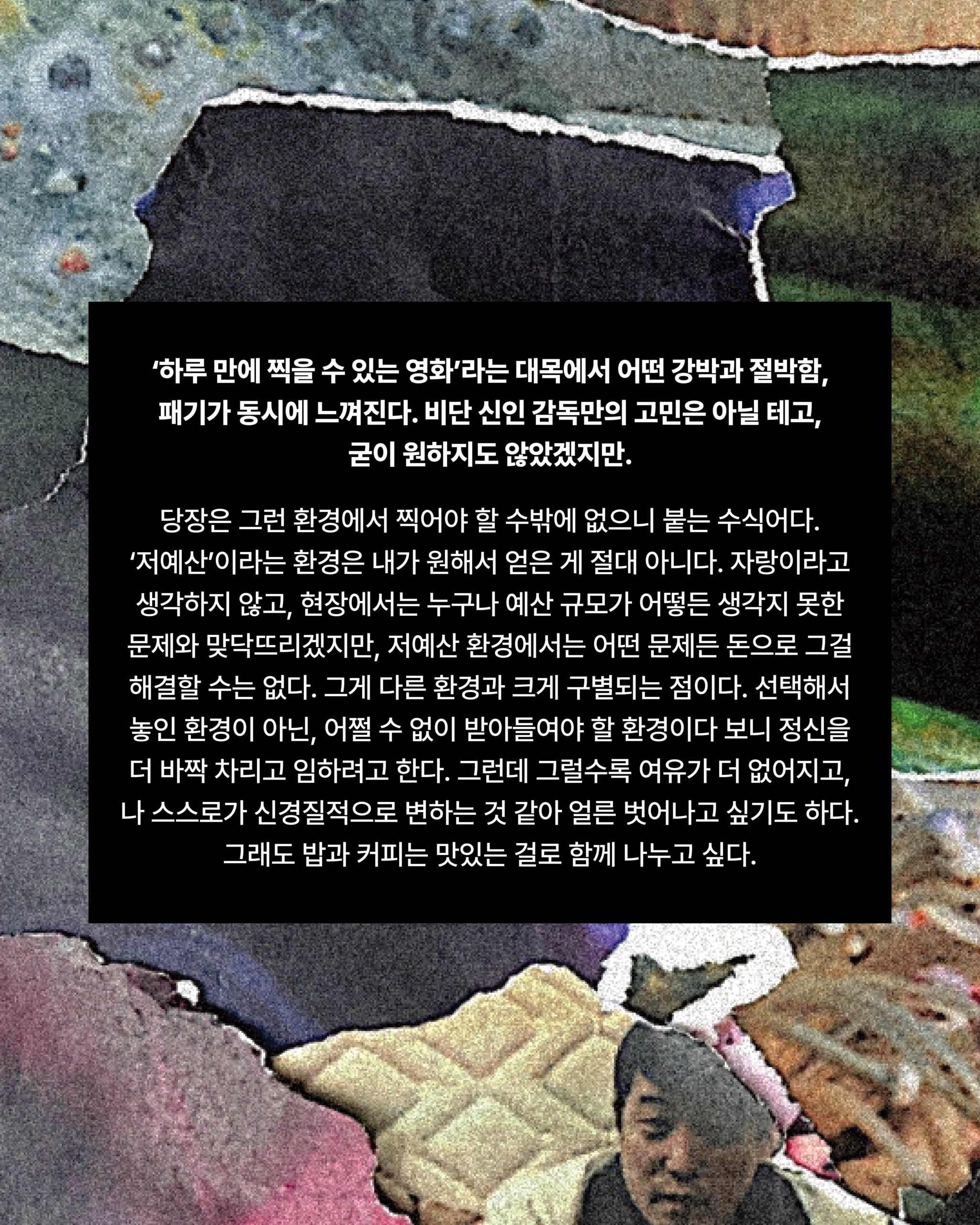 특히 ‘하루 만에 찍을 수 있는 영화’라는 대목에서 어떤 강박과 절박함, 패기가 동시에 느껴진다. 비단 신인 감독만의 고민은 아닐 테고, 굳이 원하지도 않았겠지만.