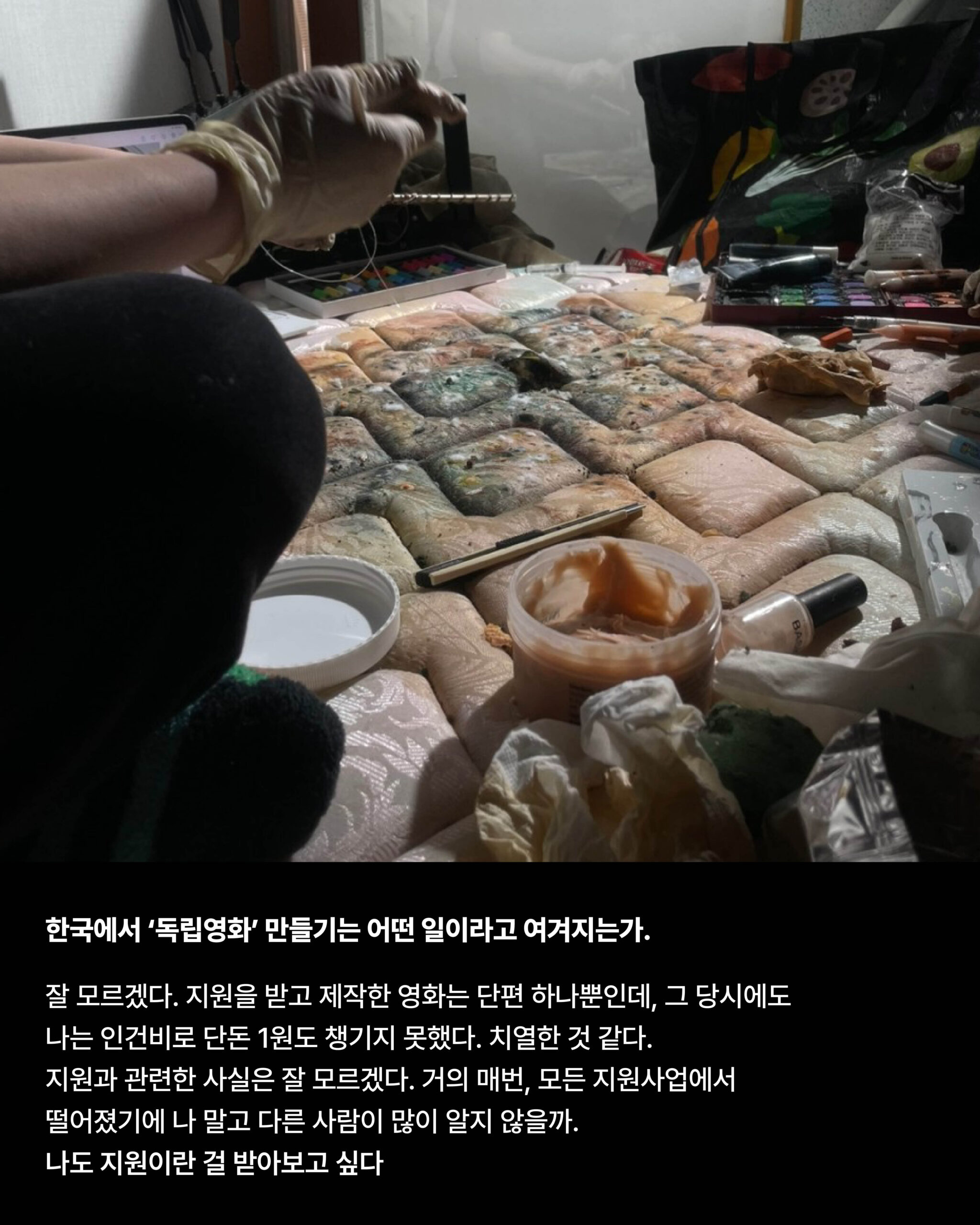 잘 모르겠다. 지원을 받고 제작한 영화는 단편 <기지국> 하나뿐인데, 그 당시에도 나는 인건비로 단돈 1원도 챙기지 못했다. 치열한 것 같다. 지원과 관련한 사실은 잘 모르겠다. 거의 매번, 모든 지원사업에서 떨어졌기에 나 말고 다른 사람이 많이 알지 않을까. 나도 지원이란 걸 받아보고 싶다.
