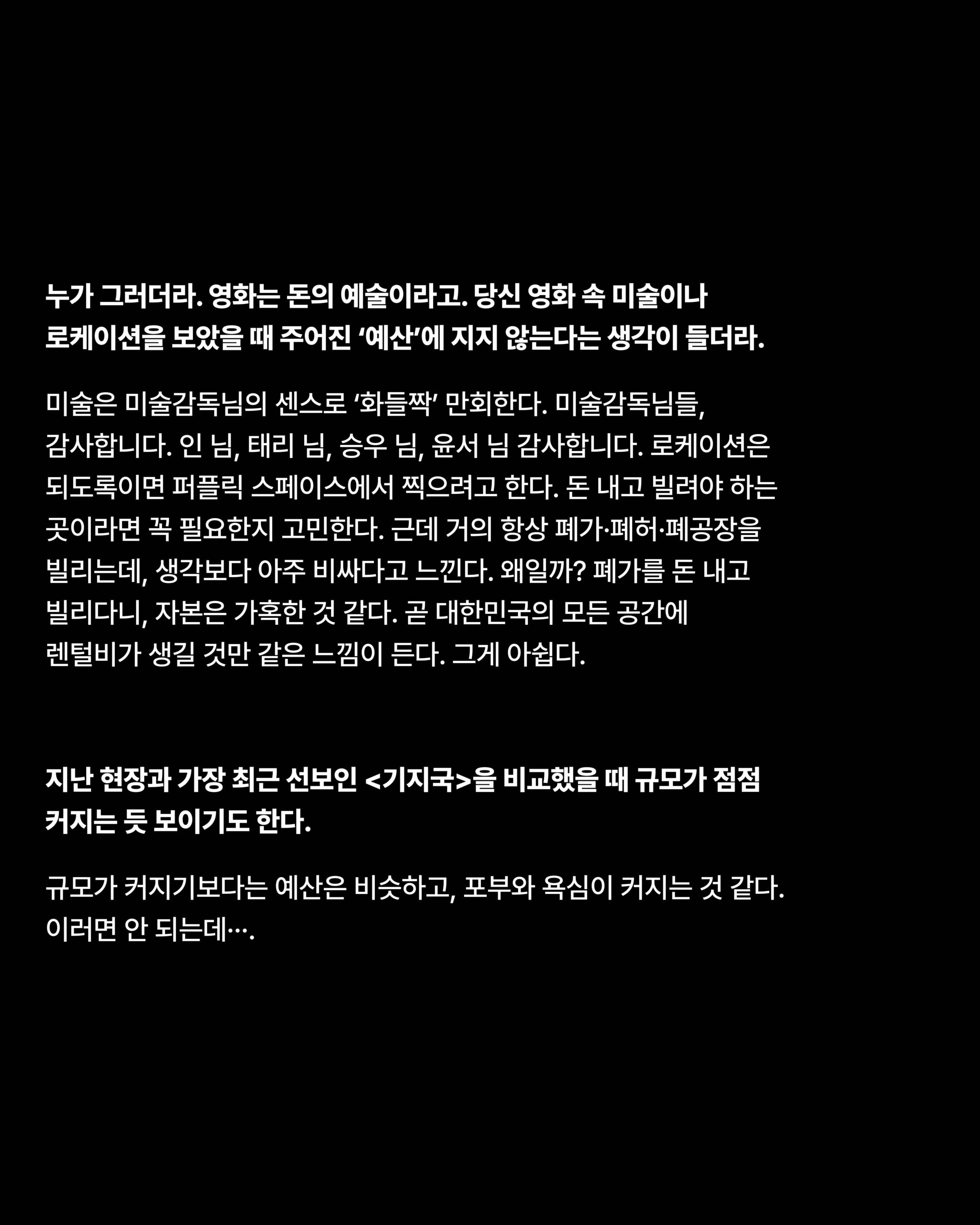 미술은 미술감독님의 센스로 ‘화들짝’ 만회한다. 미술감독님들, 감사합니다. 인 님, 태리 님, 승우 님, 윤서 님 감사합니다. 로케이션은 되도록이면 퍼플릭 스페이스에서 찍으려고 한다. 돈 내고 빌려야 하는 곳이라면 꼭 필요한지 고민한다. 근데 거의 항상 폐가·폐허·폐공장을 빌리는데, 생각보다 아주 비싸다고 느낀다. 왜일까? 폐가를 돈 내고 빌리다니, 자본은 가혹한 것 같다. 곧 대한민국의 모든 공간에 렌털비가 생길 것만 같은 느낌이 든다. 그게 아쉽다.