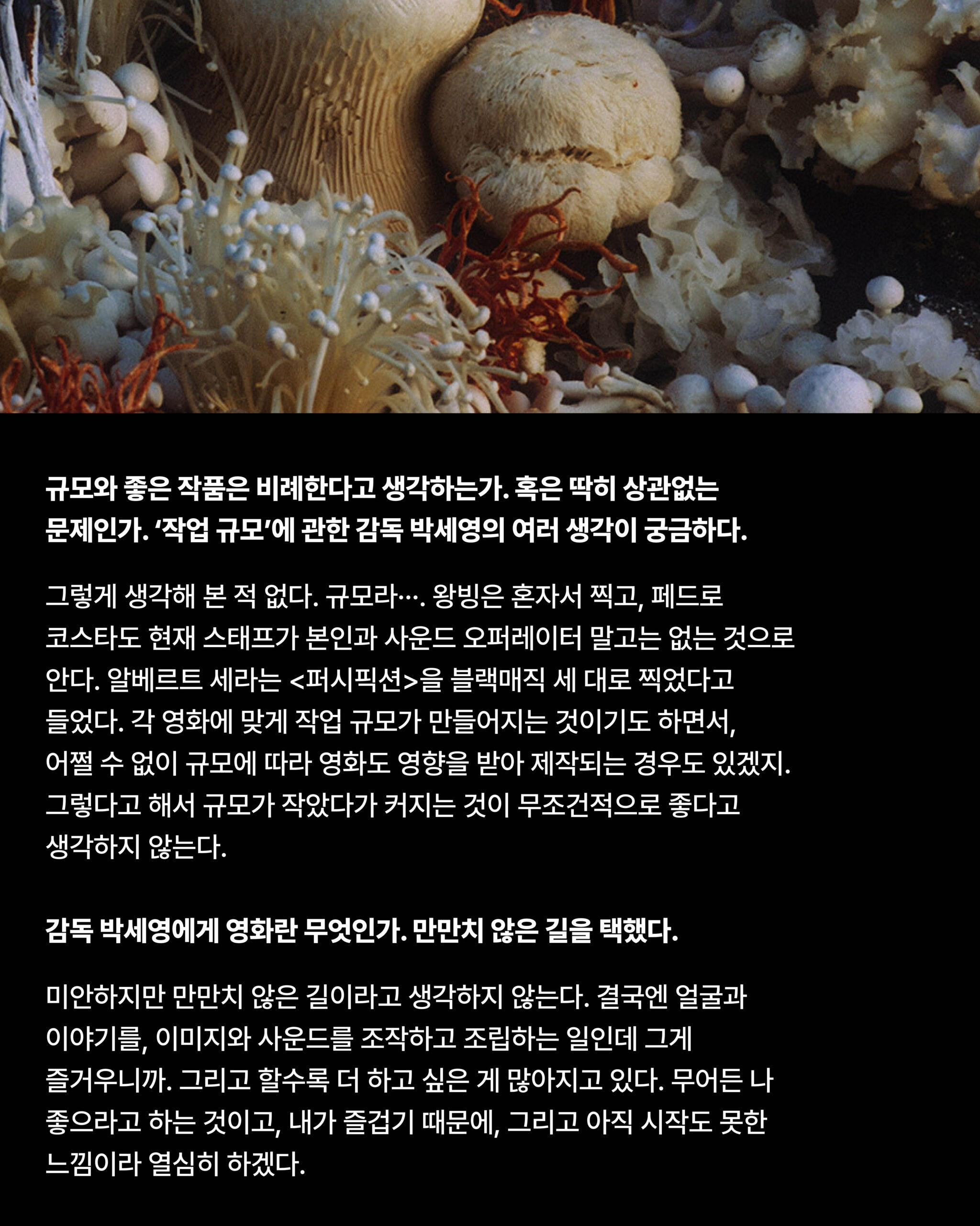 규모와 좋은 작품은 비례한다고 생각하는가. 혹은 딱히 상관없는 문제인가. ‘작업 규모’에 관한 감독 박세영의 여러 생각이 궁금하다.