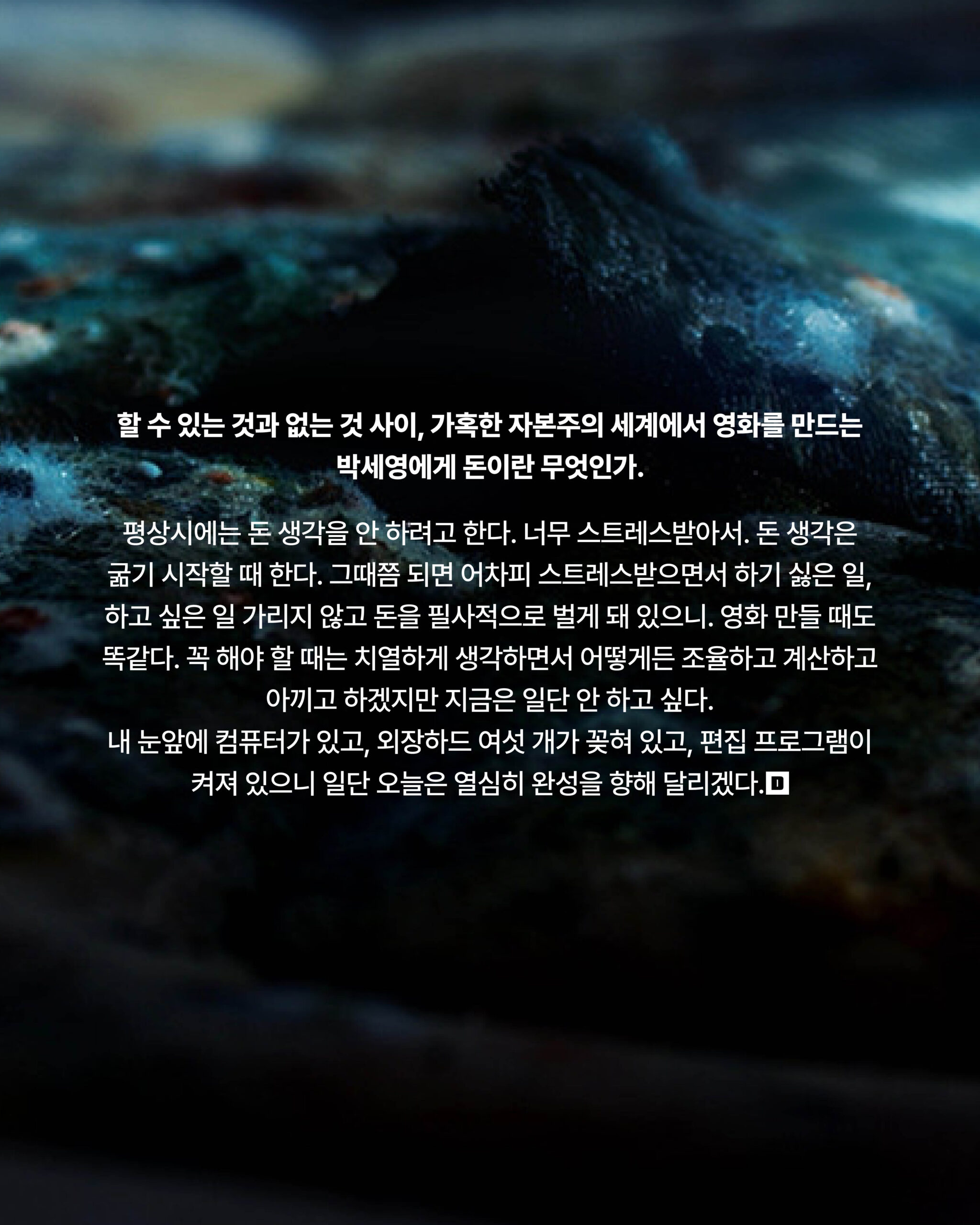 할 수 있는 것과 없는 것 사이, 가혹한 자본주의 세계에서 영화를 만드는 박세영에게 돈이란 무엇인가.