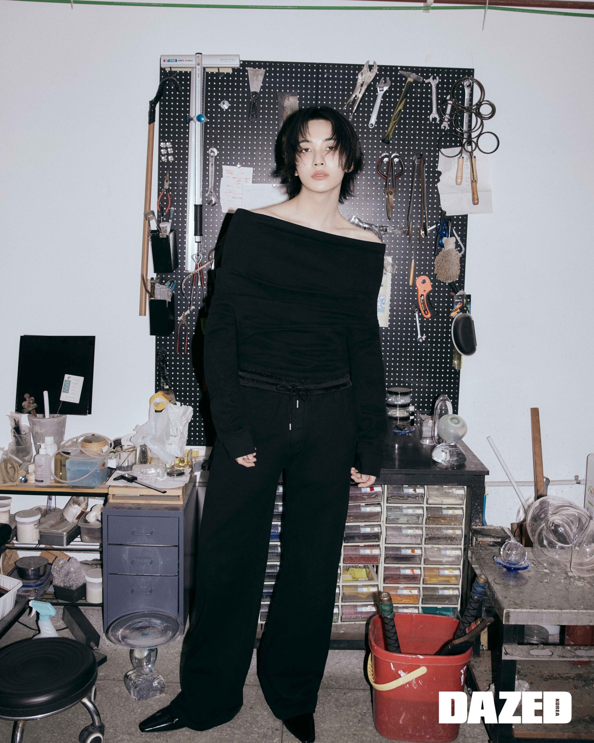 “아, 맞아! 그때 그게 였죠. 그 화보를 잊지 못해요. ‘이렇게도 화보를 찍는구나’ 파격적으로 찍어서 재밌었어요. 볼터치 잔뜩 하고, 감자들처럼 찍었잖아요.” 맞아, 우리는 겸연쩍은 미안함을 갖고 있다. 따라서 이번에는 메이크업을 덜어냈다. 중요한 건 그가 가지고 있는 태도와 표정을 담아내는 일이잖아. 그땐 몰랐네. “이번 화보에서는 새로운 시도를 많이 한 것 같아요. 슬리브리스부터 쇄골이 드러나는 실루엣 등 제가 평소에는 입지 않던 옷인데, 사진을 보니까 다 예쁘게 나왔더라고요. ‘아, 이런 것도 좋구나’ 생각했죠. 베를린에서 열린 생 로랑 쇼의 옷을 보기만 했는데, 직접 입어보니까 역시 생 로랑 옷이 좋다는 걸 다시 한번 느꼈어요.”