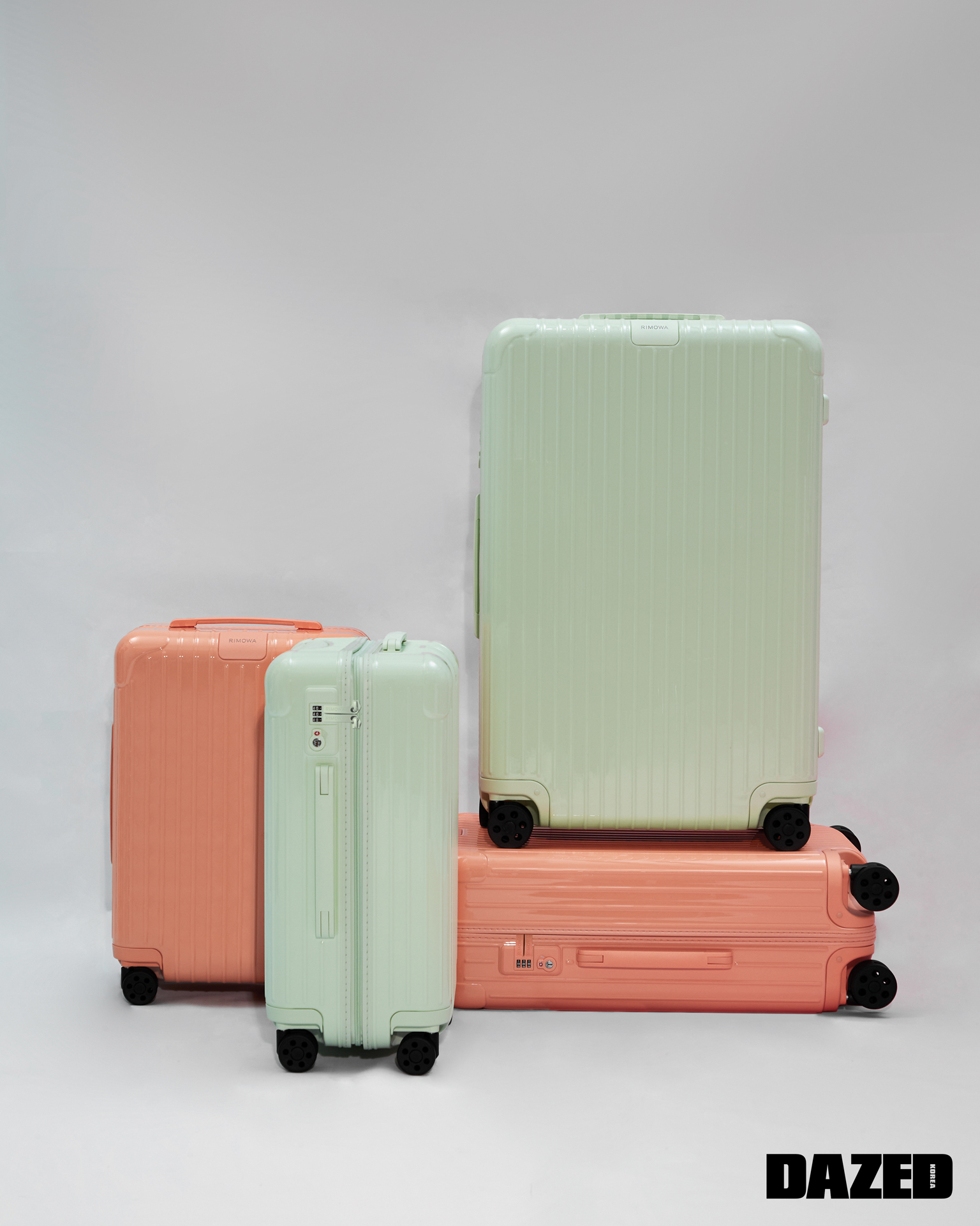 파파야 컬러의 에센셜 체크-인 M 사이즈 슈트케이스와 파파야 컬러의 에센셜 캐빈 슈트케이스,민트 컬러의 체크-인 L 사이즈 슈트케이스, 민트 컬러의 에센셜 캐빈 슈트케이스는 모두 리모와(RIMOWA).