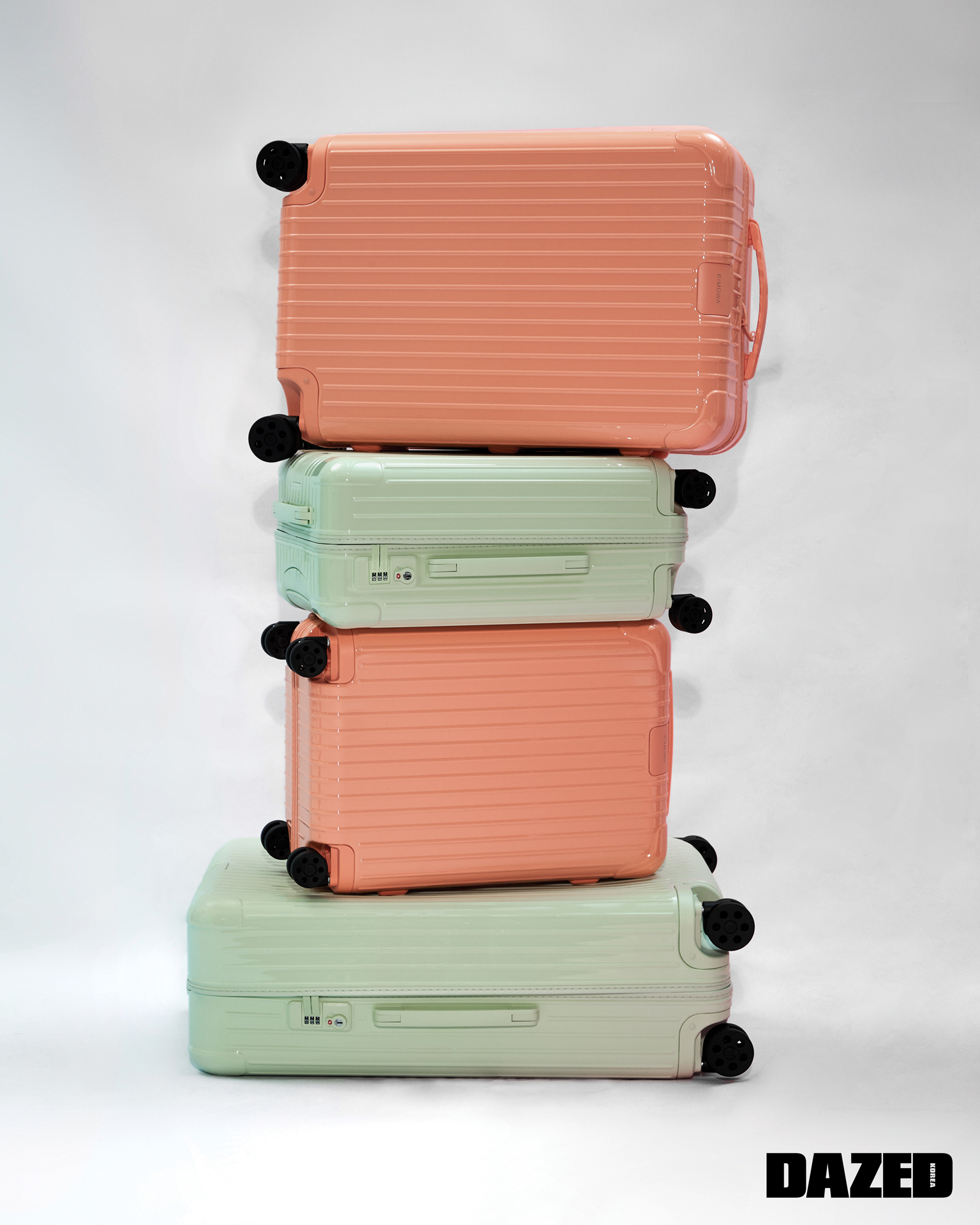 파파야 컬러의 에센셜 체크-인 M 사이즈 슈트케이스와 파파야 컬러의 에센셜 캐빈 슈트케이스, 민트 컬러의 체크-인 L 사이즈 슈트케이스, 민트 컬러의 에센셜 캐빈 슈트케이스는 모두 리모와(RIMOWA).