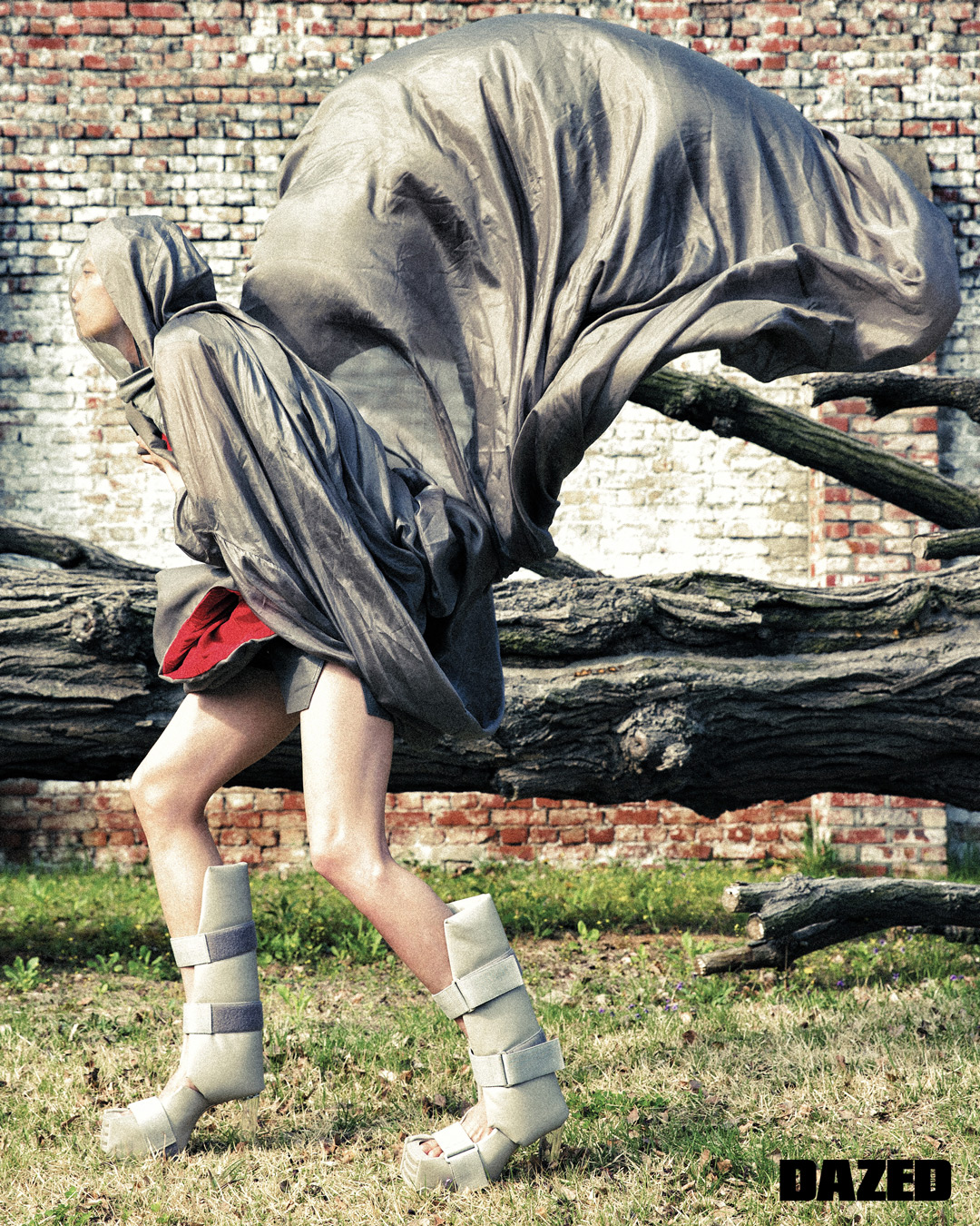 그레이 컬러 우븐 코트와 저지 톱, 티셔츠, 레더 쇼츠, 실크 마스크, 플랫폼 하이힐 샌들 부츠는 모두 릭 오웬스(Rick Owens).