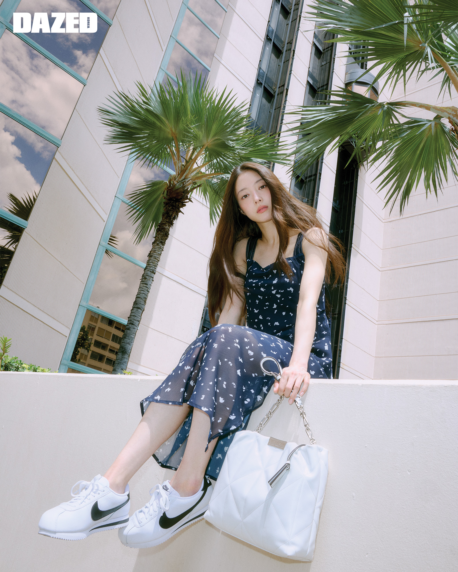 잔잔한 프린트 패턴의 드레스와 숄더백은 조이그라이슨(Joy Gryson), 스니커즈는 나이키(Nike).
