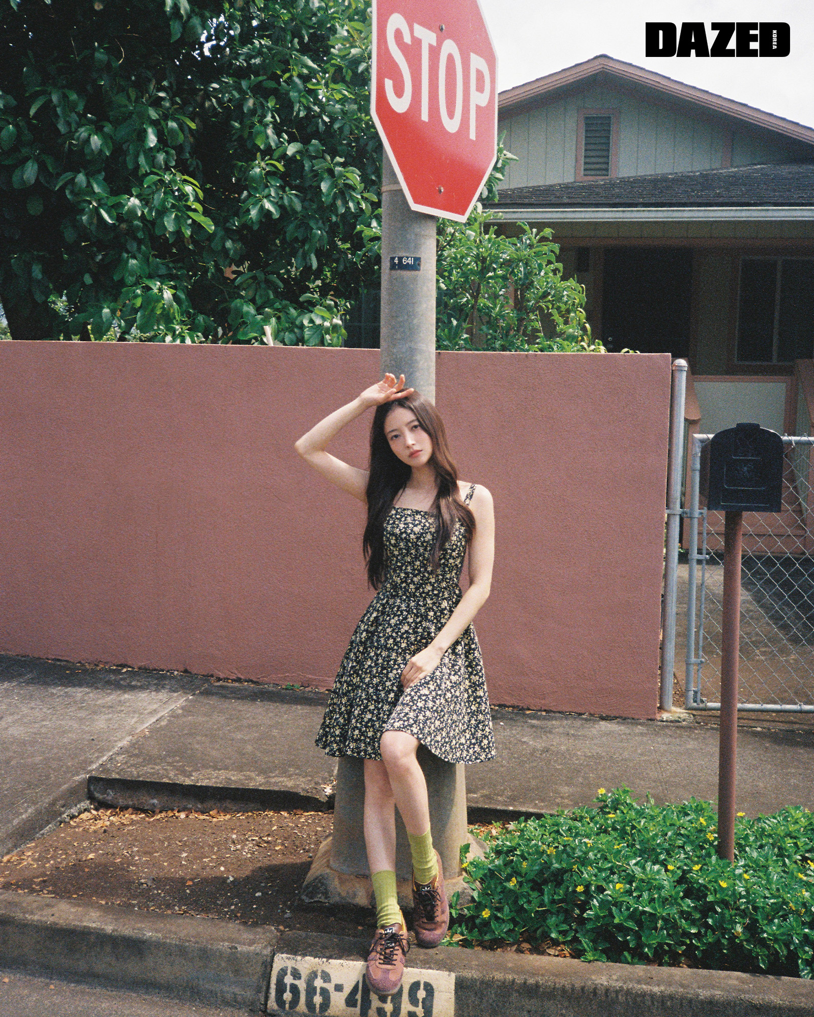 플라워 프린트 미니드레스는 솔트앤초콜릿(Salt & Chocolate), 스니커즈는 아디다스 오리지널스(adidas Originals), 삭스는 스타일리스트의 것.