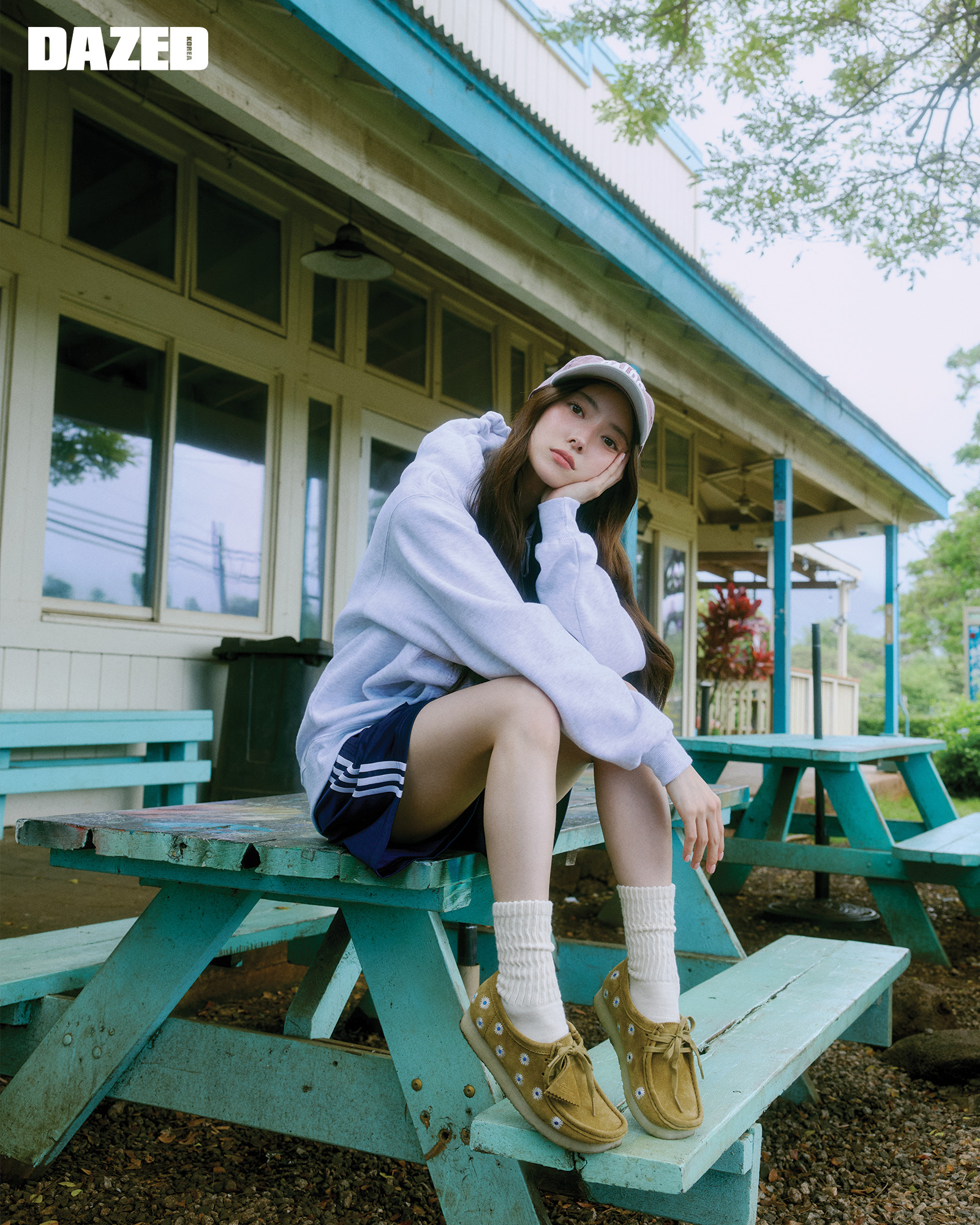 오버사이즈 스웨트 후디와 볼캡은 페얼스(Pairs), 쇼츠는 아디다스 (adidas), 슈즈는 클락스 오리지널스(Clarks Originals), 삭스는 스타일리스트의 것.