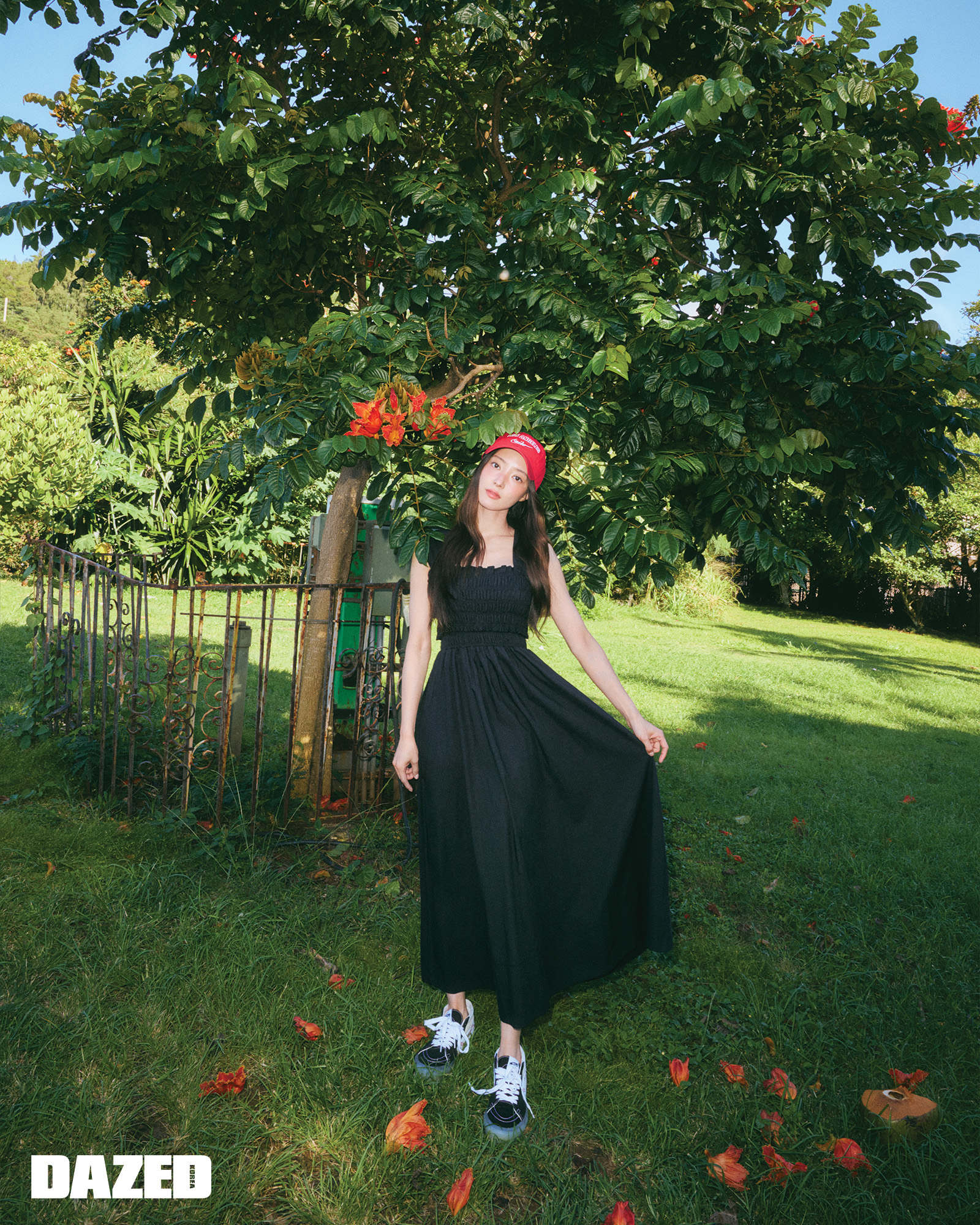스모킹 디테일이 포인트인 맥시 드레스는 클럽모나코(Club Monaco), 스니커즈는 볼트 바이 반스 X 팜 엔젤스(Vault by Vans X Palm Angels), 볼캡은 스타일리스트의 것.