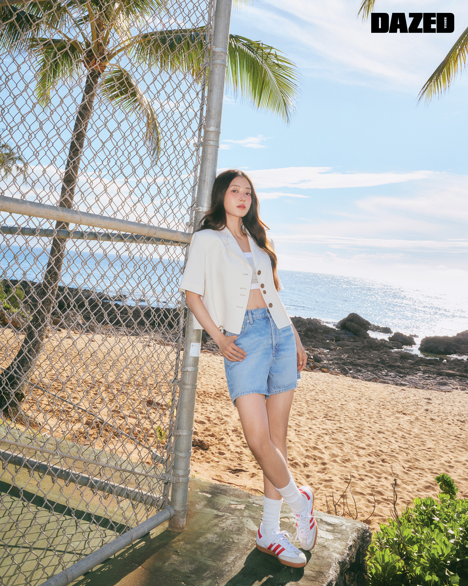 테일러링이 돋보이는 반팔 재킷은 루에브르(Loeuvre), 그레이 브라렛은 타입서비스(TypeService), 데님 쇼츠는 앤아더스토리즈(&otherstories), 스니커즈는 아디다스 오리지널스(adidas Originals), 화이트 브라렛과 삭스는 스타일리스트의 것.