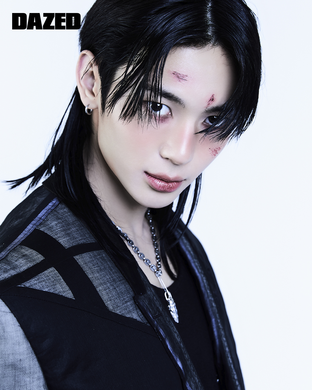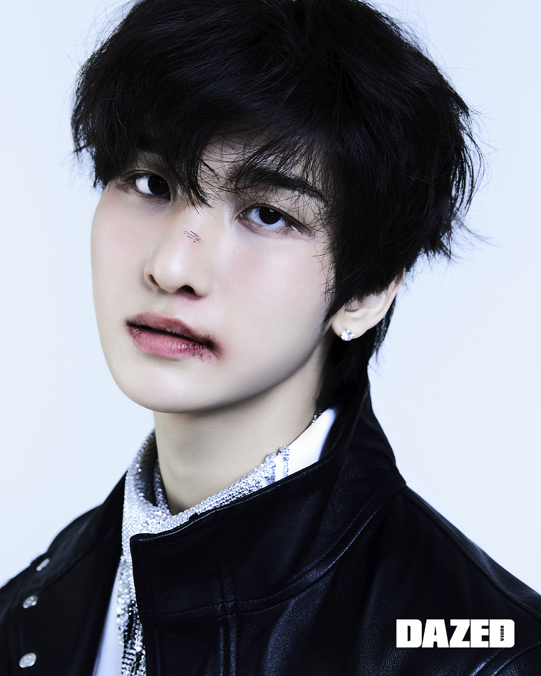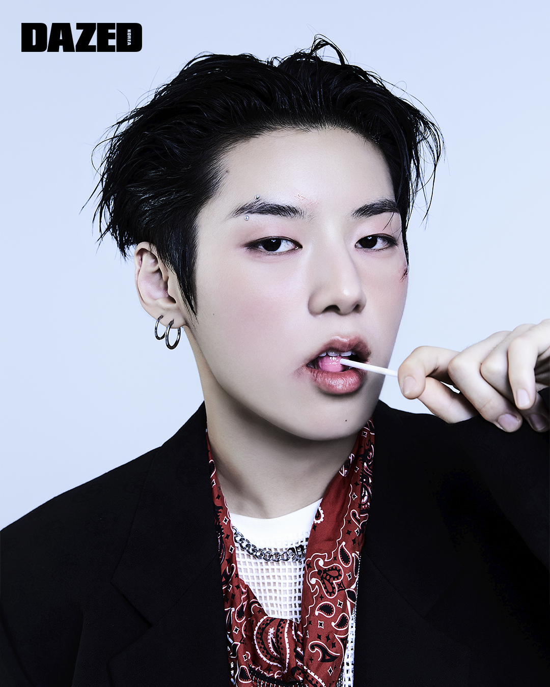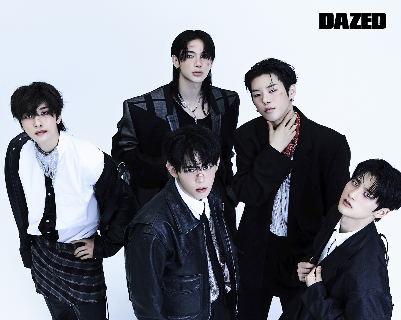 연우가 입은 레더 셋업은 카미긴(Kamigin), 넥타이 프린트 셔츠는 세이모우(Ceimou), 체크 스커트와 실버 컬러 스카프, 이어링은 모두 에디터의 것. 시윤이 입은 재킷과 팬츠는 오웬스(Rick Owens), 네크리스는 카미긴(Kamigin), 슬리브리스 톱은 에디터의 것. 현빈이 입은 레더 재킷은 워크인파리스(Walkinparis), 셔츠와 실버 컬러 슬리브리스 톱, 타이는 모두 에디터의 것. 진혁이 입은 재킷과 메시 톱, 팬츠, 스커트, 레드 스카프는 모두 에디터의 것, 이어링은 진혁의 것. 이 입은 슬릿 디테일 재킷은 김미더영(Gimmetheyoung),셔츠는 에디터의 것.