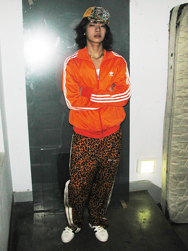 노 로고 핑크 스몰 집업 후디와 레오퍼드 크루넥 니트, 50-50 팬츠, 보틀 캡 벨트는 모두 발렌시아가(Balenciaga).