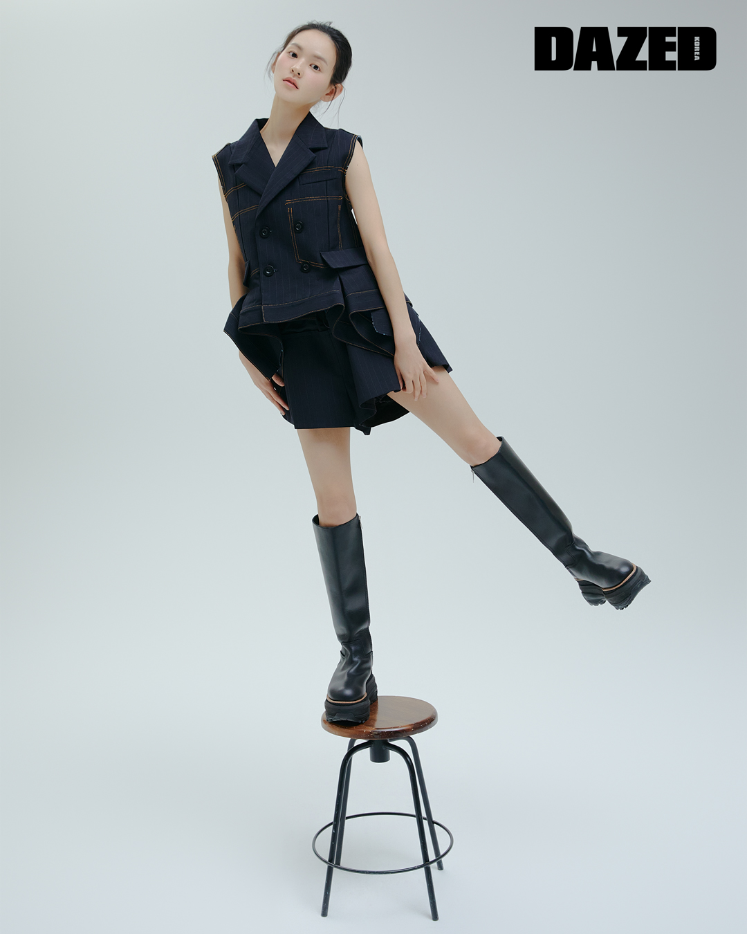 데님 베스트와 쇼트 팬츠, 부츠는 모두 사카이(Sacai).