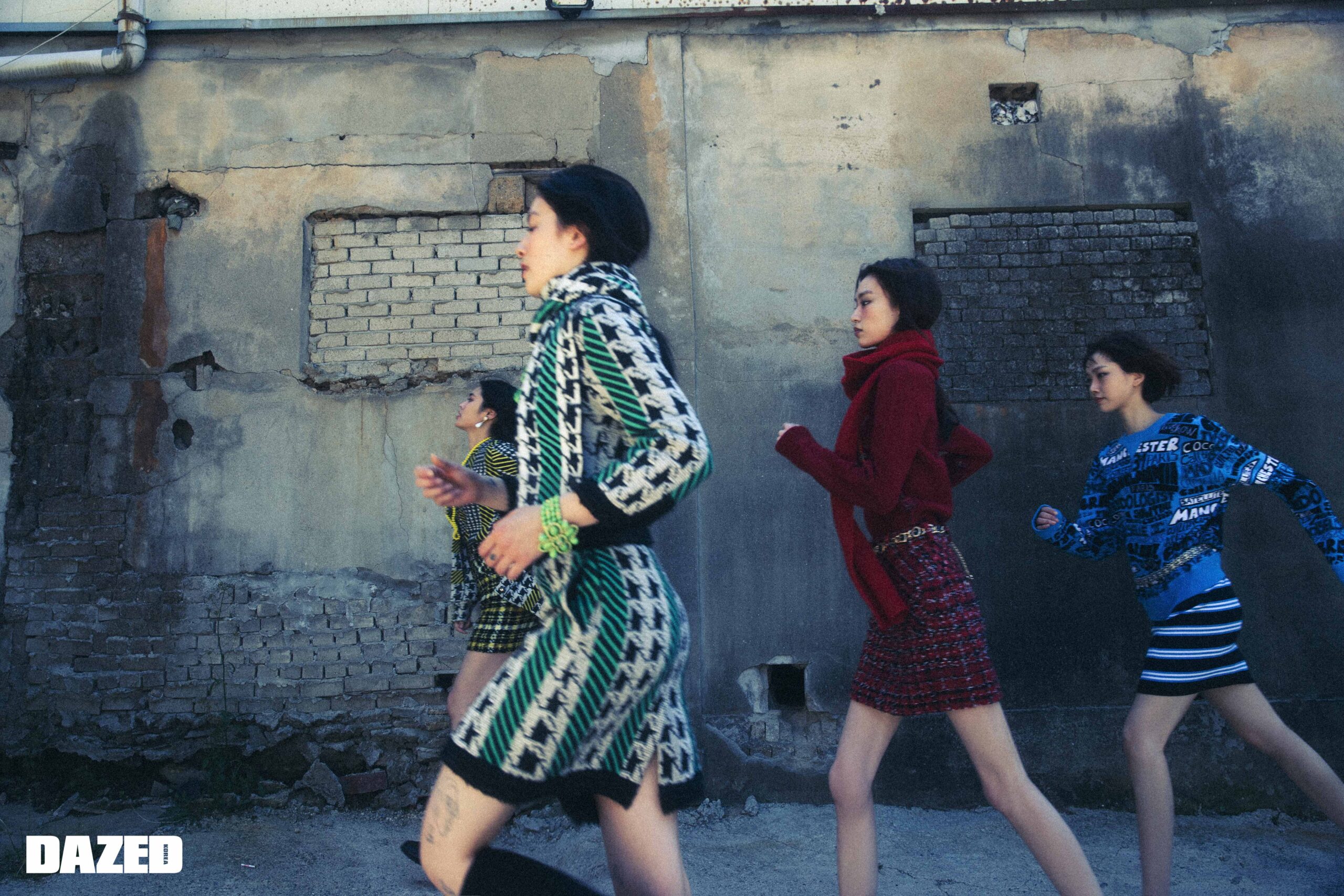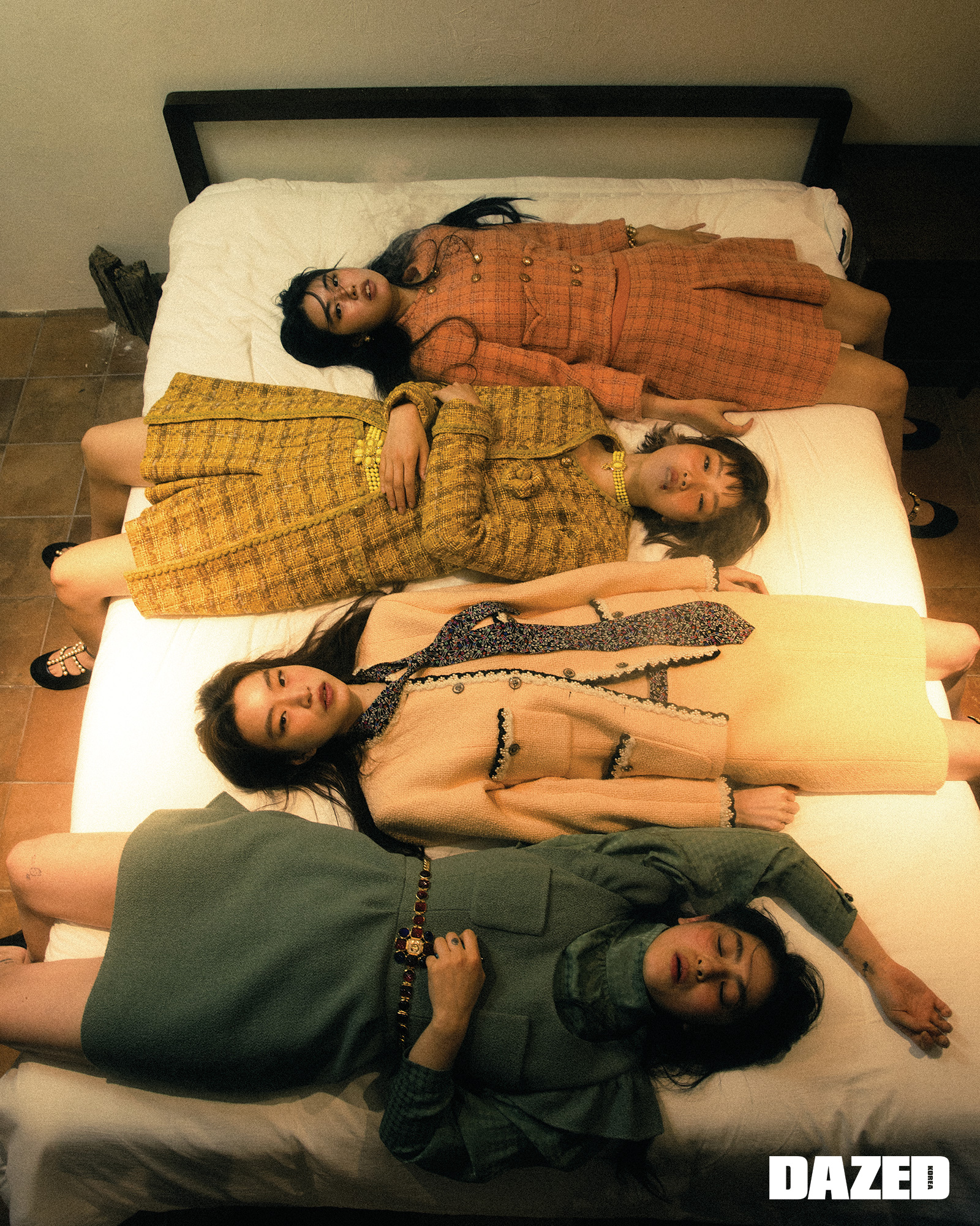 채은이 입은 울 트위드 소재의 재킷과 스커트와 메리제인, 까멜리아 브로치는 모두 샤넬(Chanel). 서연이 입은 울 트위드 소재의 코트와 퀼로트, 이미테이션 펄로 장식한 고트스킨 소재의 메리제인, 까멜리아 브로치, 글라스 펄 장식의 체인 벨트, 글라스 펄로 장식한 메탈과 레진 소재의 초커는 모두 샤넬(Chanel). 재이가 입은 울 트위드 소재의 재킷과 스커트 셋업, 실크 크레이프 소재의 타이는 모두 샤넬(Chanel). 나오미가 입은 울 트위드 소재의 드레스와 실크 자카드 소재의 블라우스, 램스킨 소재의 메리제인, 메탈과 글라스 소재의 벨트는 모두 샤넬(Chanel).