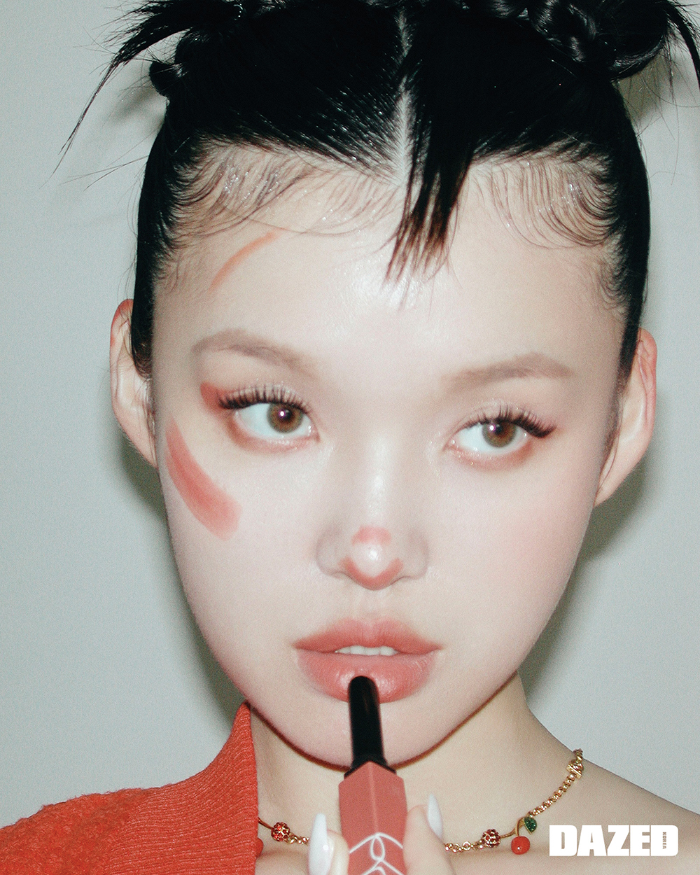 <데이즈드>에는 화장한 사람이 많지 않다. 그러던 중 눈에 들어온 루시. 그에게 물었다. “오늘 메이크업 룩은 어떤 거예요?”, “헬무트 랭 페인트 팬츠를 입었으니 이 룩에 어울리는 메이크업을 했어요. 이게 오늘 제 정체성이에요.” 슈프림을 입은 날에는 가벼운 베이스 메이크업과 MLBB 컬러 립스틱을, 생 로랑을 입은 날에는 커버력이 뛰어난 파운데이션을 바르고 아이라인은 얇고 길게 빼 그리기. 오늘 어떤 옷을 입을지 정하는 것처럼, 오늘 어떤 메이크업 룩을 연출하느냐에 따라 내 이미지도 바뀐다. 페이크 아이래시를 붙이고 하이라이터로 콧대를 쓸어내리고 오버 립을 그렸더니 완성된 오늘의 가면. 순식간에 얼굴 모습이 휙휙 바뀌는 경극의 변검술처럼 얼굴에 스펀지와 브러시를 몇 번 갖다대니 그 방점에는 내가 꿈꾸는 얼굴이 있다. 메이크업으로 내가 꿈꾸는 정체성을 직접 그려나가는 것이다.