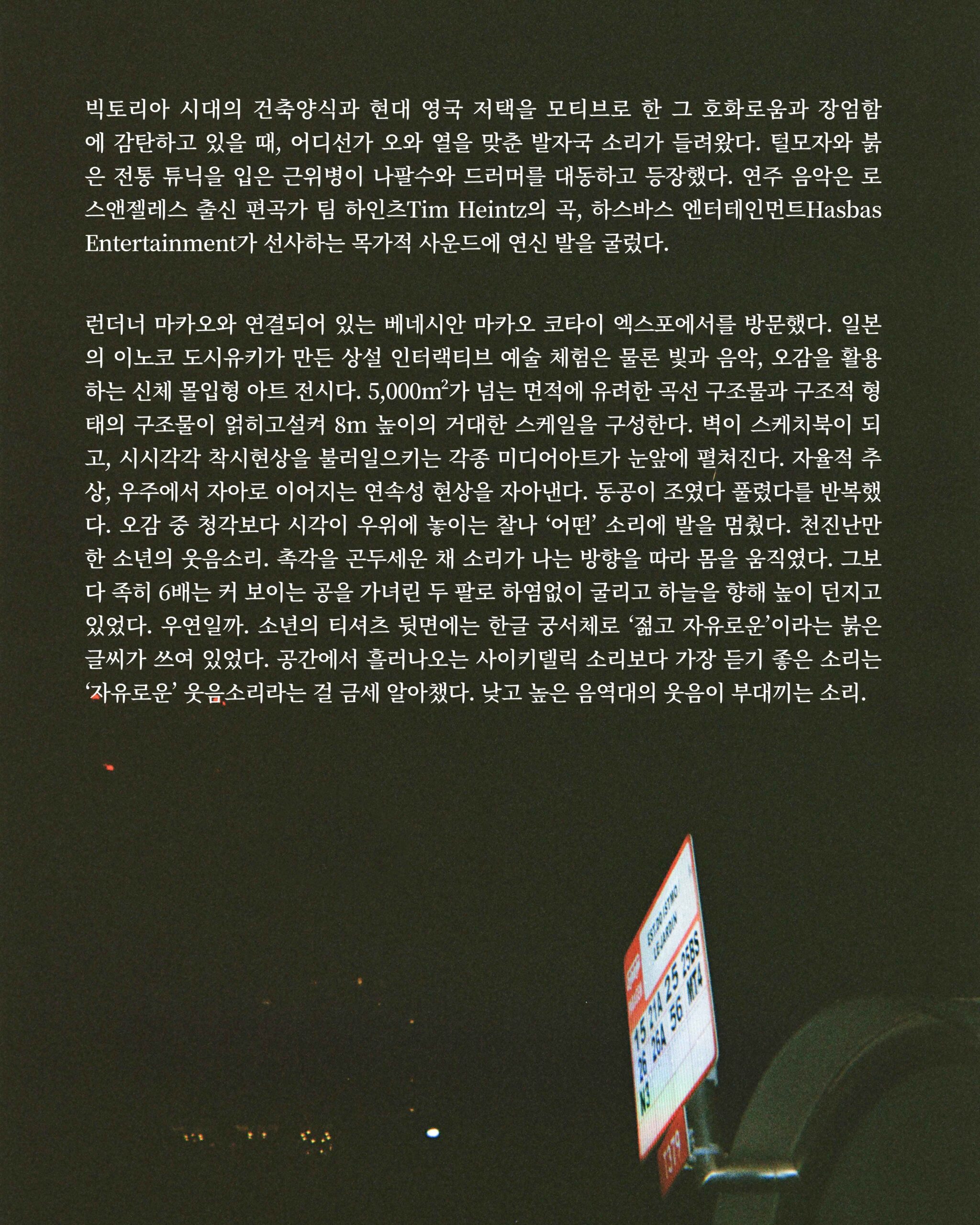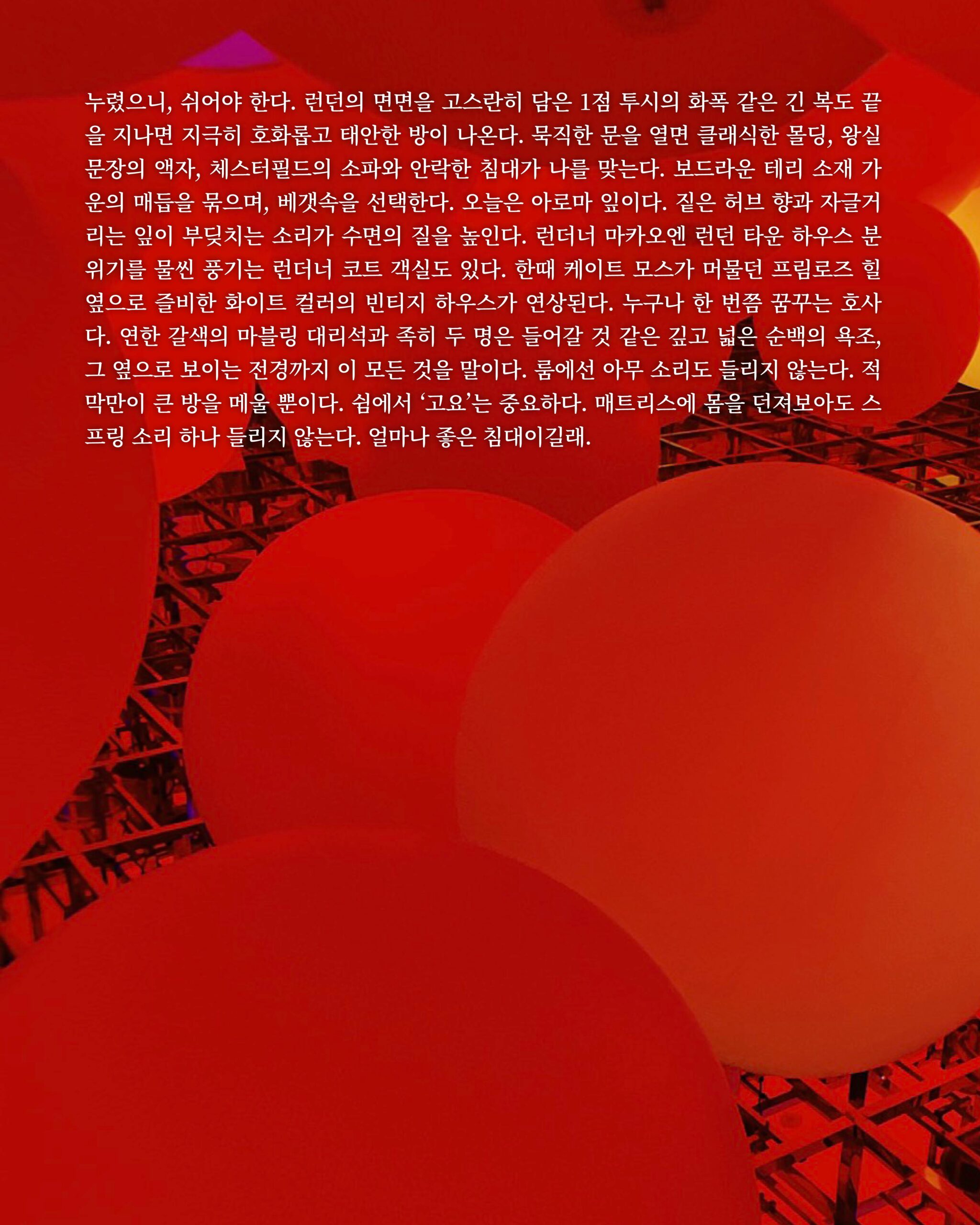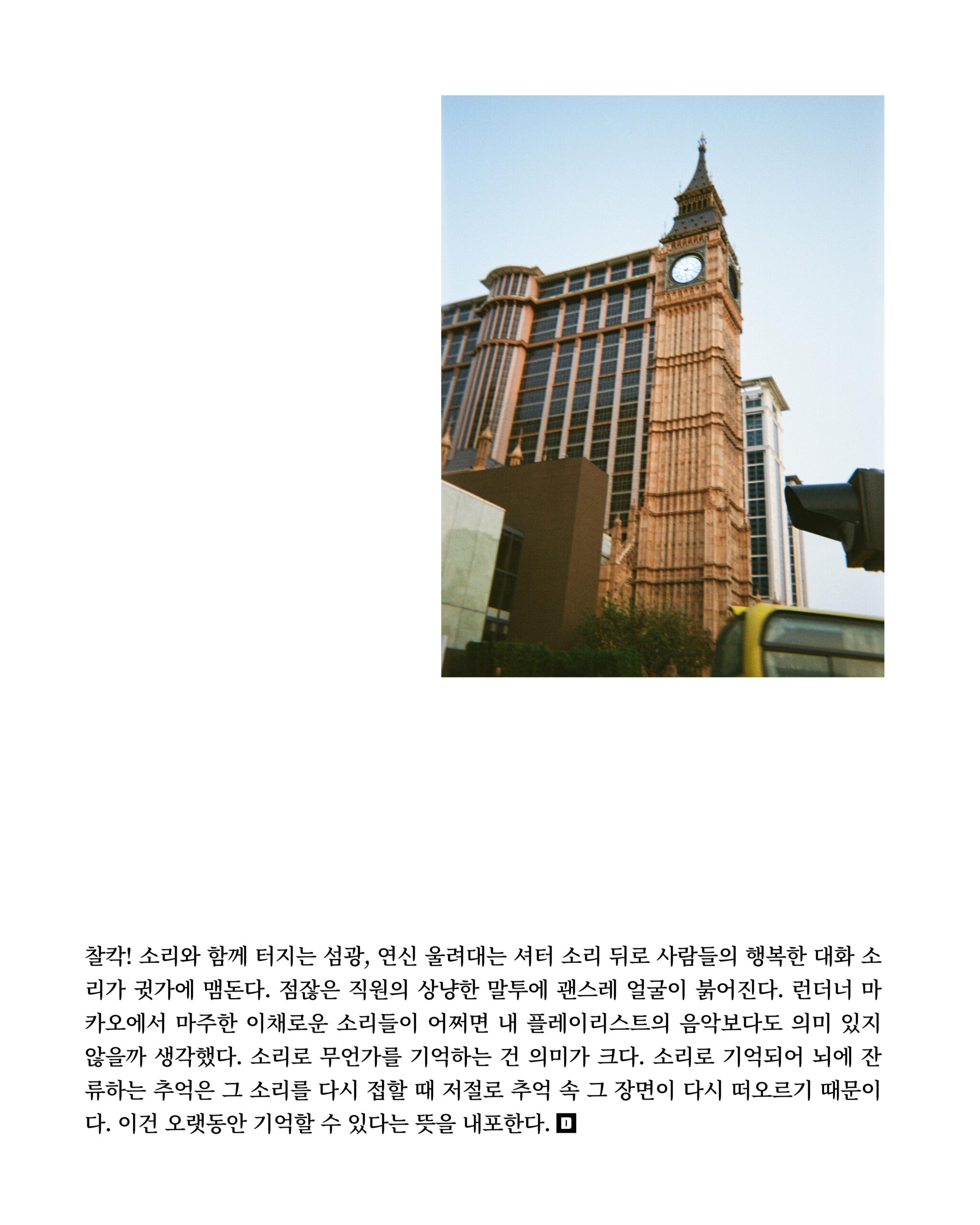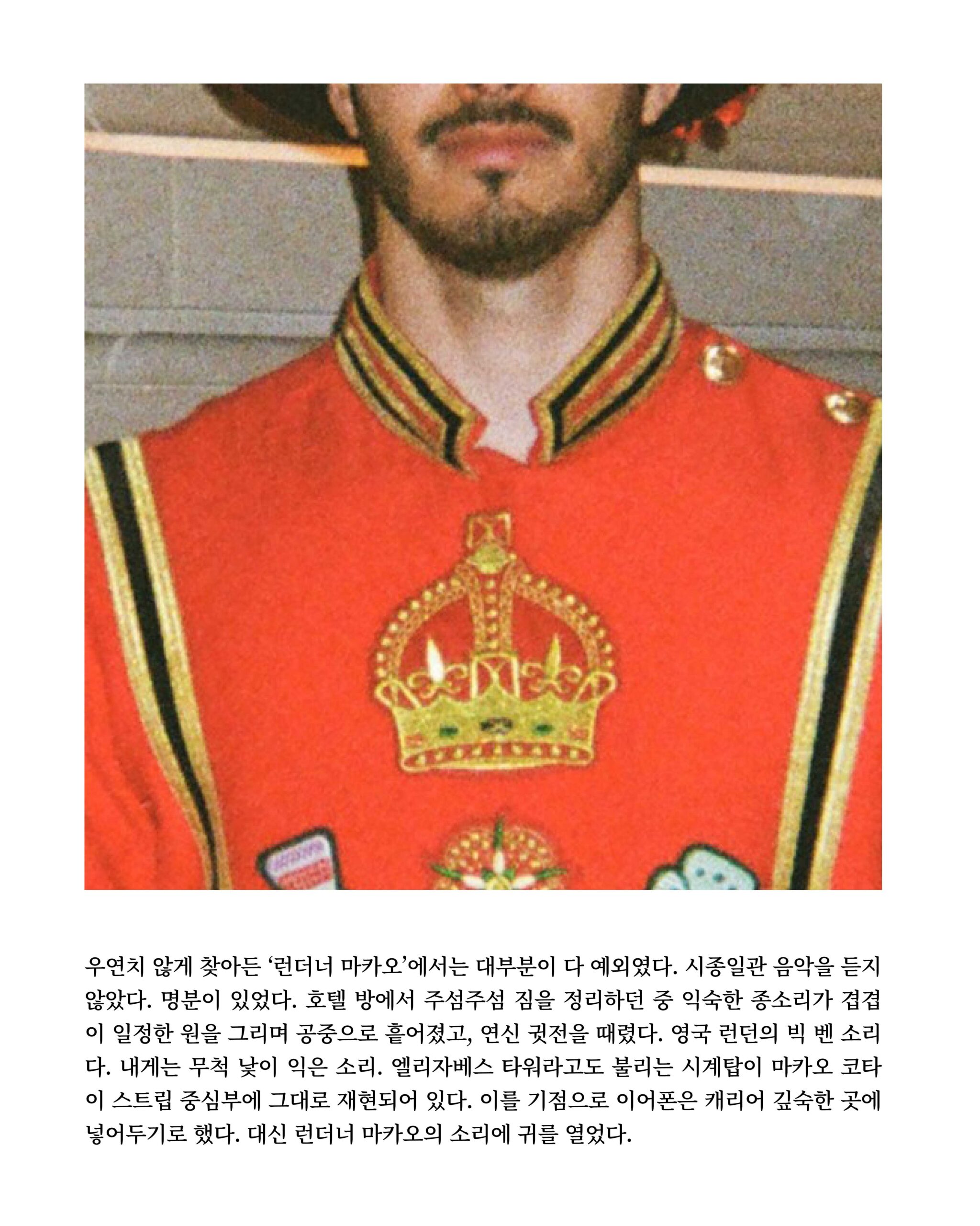 날씨가 흐리길 바랐고, 비가 내리길 원했다. 런던에서 자주 듣던 명쾌한 듯 둔탁한 빗방울 소리를 듣고 싶었을까. 바라던 대로 이뤄졌다. 런더너 마카오 입구에 도착했을 때, 유리로 된 돔 형태의 웅장한 포르트 코셰르 위로 후드득 떨어지는 빗소리가 무척이나 반가웠다. 물방울을 튕겨내는 방수 소재의 후드 재킷에 달린 모자를 푹 눌러쓰고 늘 걷던 센트럴 세인트 마틴 앞, 그 빅토리아역으로 시간이 역행한 듯했다. 소리와 정경 모두 맞아떨어졌다. 회상은 뒤로 미루고, 바쁜 걸음을 돌려 로비로 향했다. 그리스 로마 신화 속 사랑의 신 안테로스 조각상을 마주했다. 아트리움 공간의 섀프츠베리 기념 분수에서 시원하게 낙하하는 분수대의 물이 마치 빗소리를 확장한 듯했다.