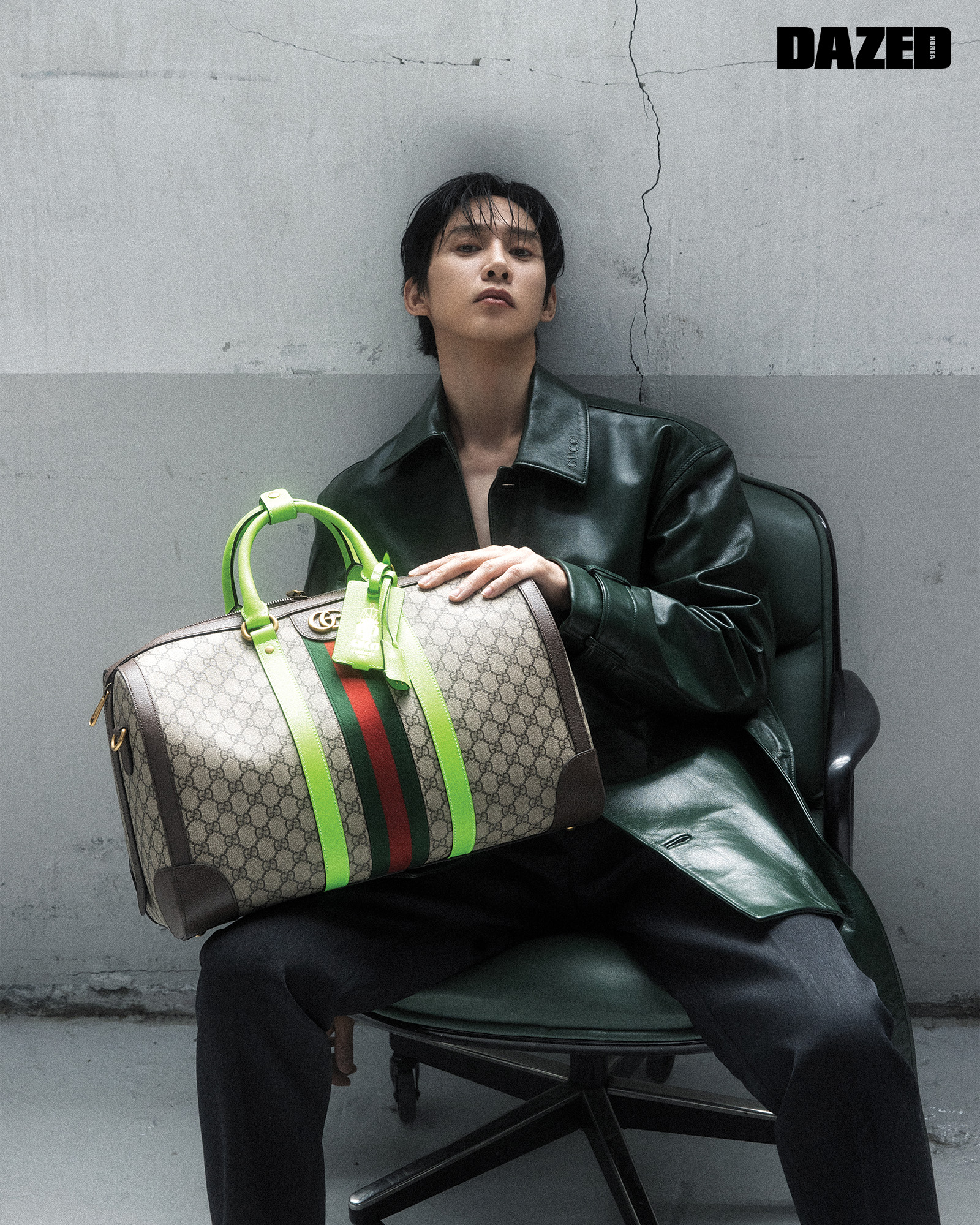 메탈 스냅 훅 벨트 디테일의 그린 샤이니 카프레더 카반 재킷과 그레이 울 포멀 팬츠, 구찌 사보이 브라이트 그린 트림 디테일의 GG 수프림 캔버스 미디엄 더플백은 모두 구찌(Gucci).