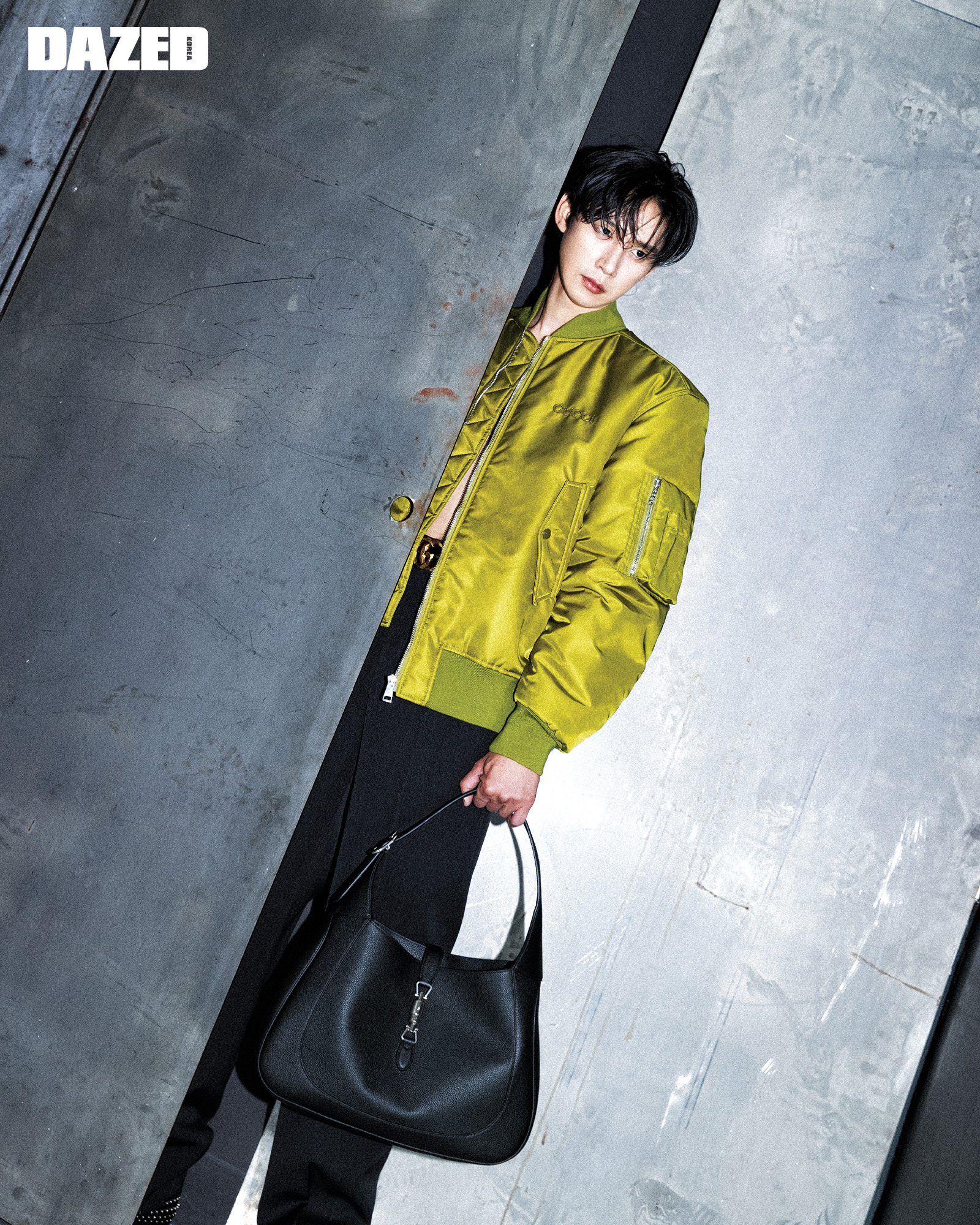 구찌 디테일의 라이트 그린 나일론 트윌 보머 재킷과 엠브로이더리 장식과 슬릿 디테일의 다크 그레이 울 팬츠, 스터드와 홀스빗 디테일의 블랙 레더 솔 모카신, 더블 G 버클 디테일 레더 벨트, 구찌 재키 웹 숄더 스트랩 디테일의 블랙 레더 라지 호보 백은 모두 구찌(Gucci).