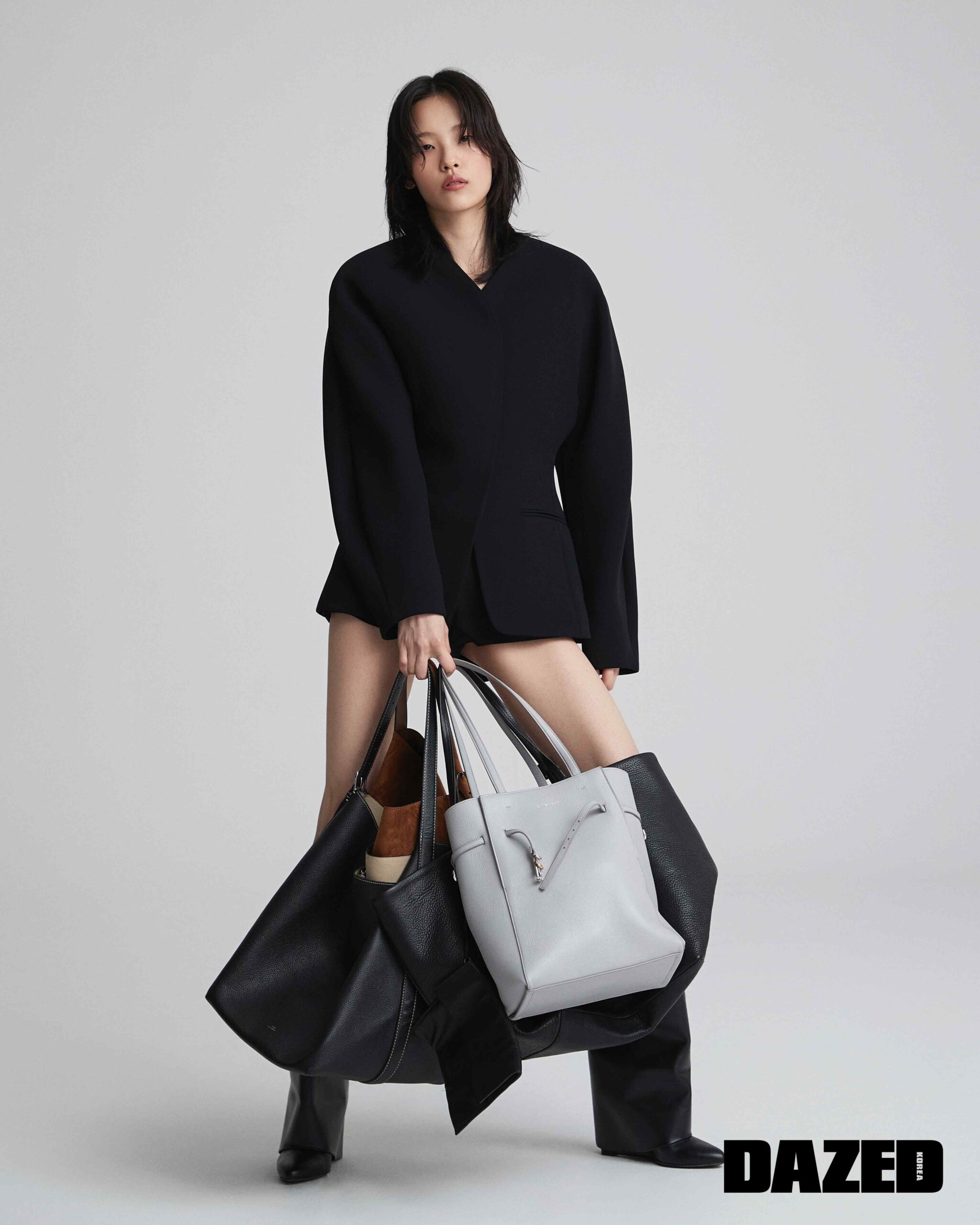 부아유 미디엄 라미네이티드 레더 백과 부츠는 지방시(Givenchy), 벨티드 스웨이드 토트백과 벨티드 그레인 레더 토트백은 토템(Toteme), 스트랩 그레인 레더 토트백은 더 로우(The Row), 재킷은 자크뮈스(Jacquemus), 쇼츠는 에디터의 것.