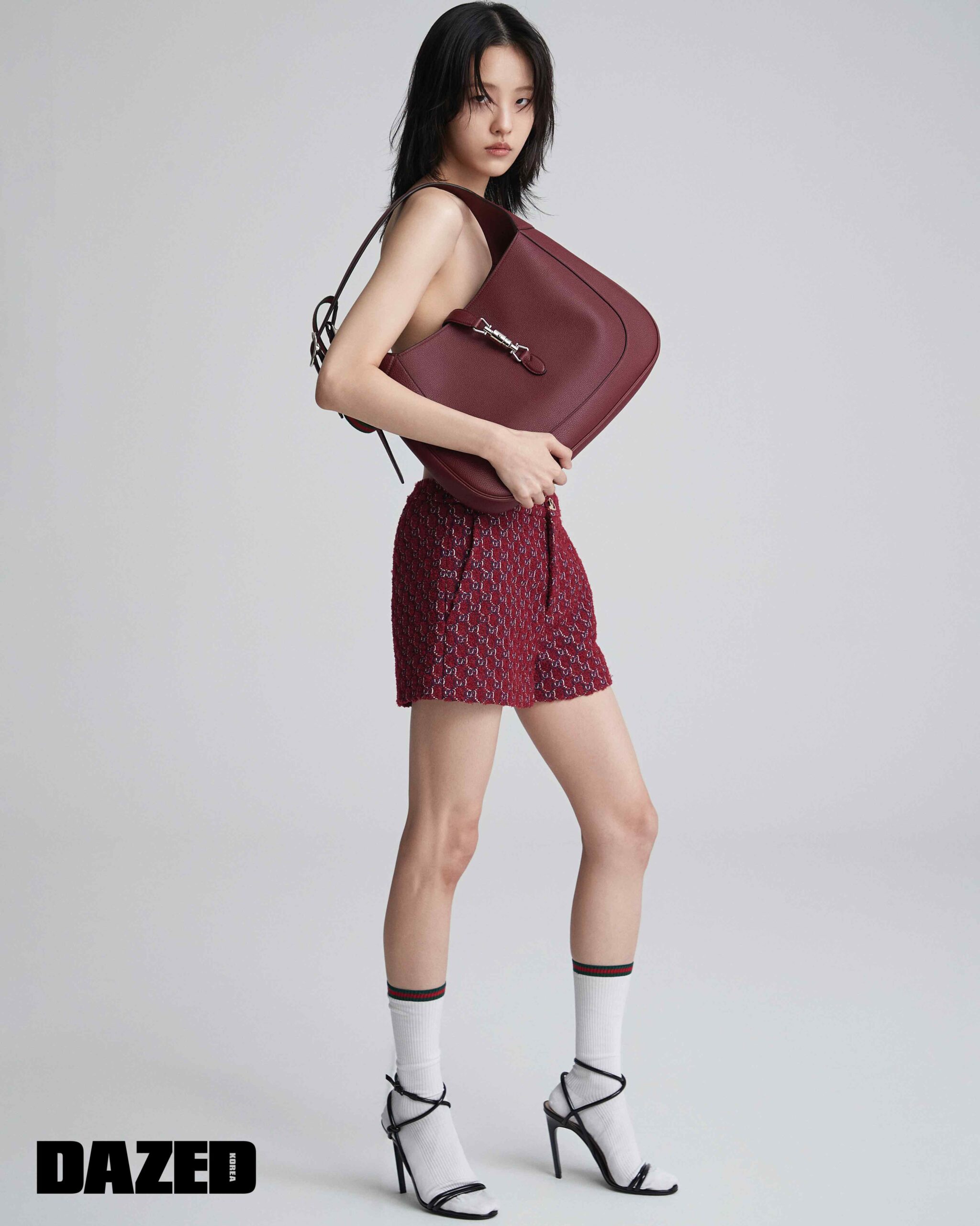 숄더 스트랩 디테일의 호보 백과 부클레 쇼츠, 블랙 페이턴트 하이힐 샌들, 웹 디테일의 화이트 립-코튼 삭스는 모두 구찌(Gucci).