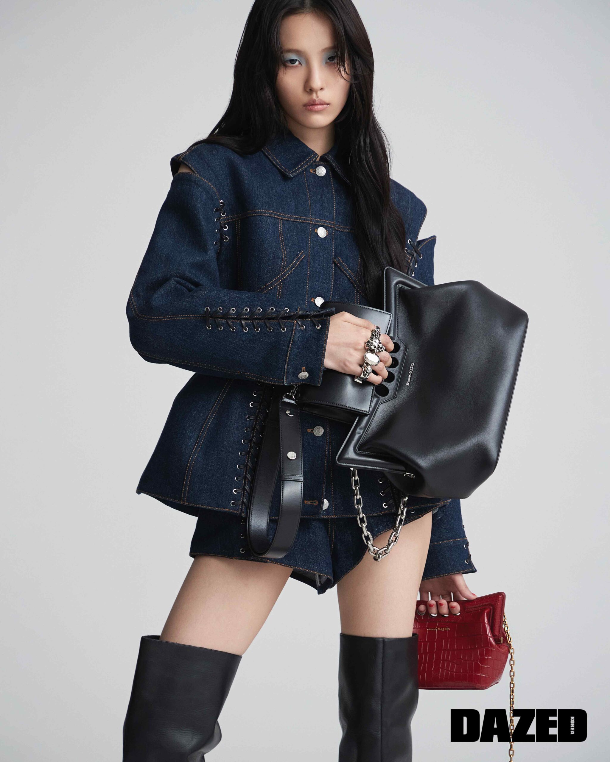 오른손에 든 바이커 미니 주얼 사첼 백과 피크 체인 백, 왼손에 든 미니 피크 백, 레더 스트랩 디테일의 데님 재킷, 인디고 데님 쇼츠, 아르마딜로 부츠는 모두 알렉산더 맥퀸(Alexander McQueen).