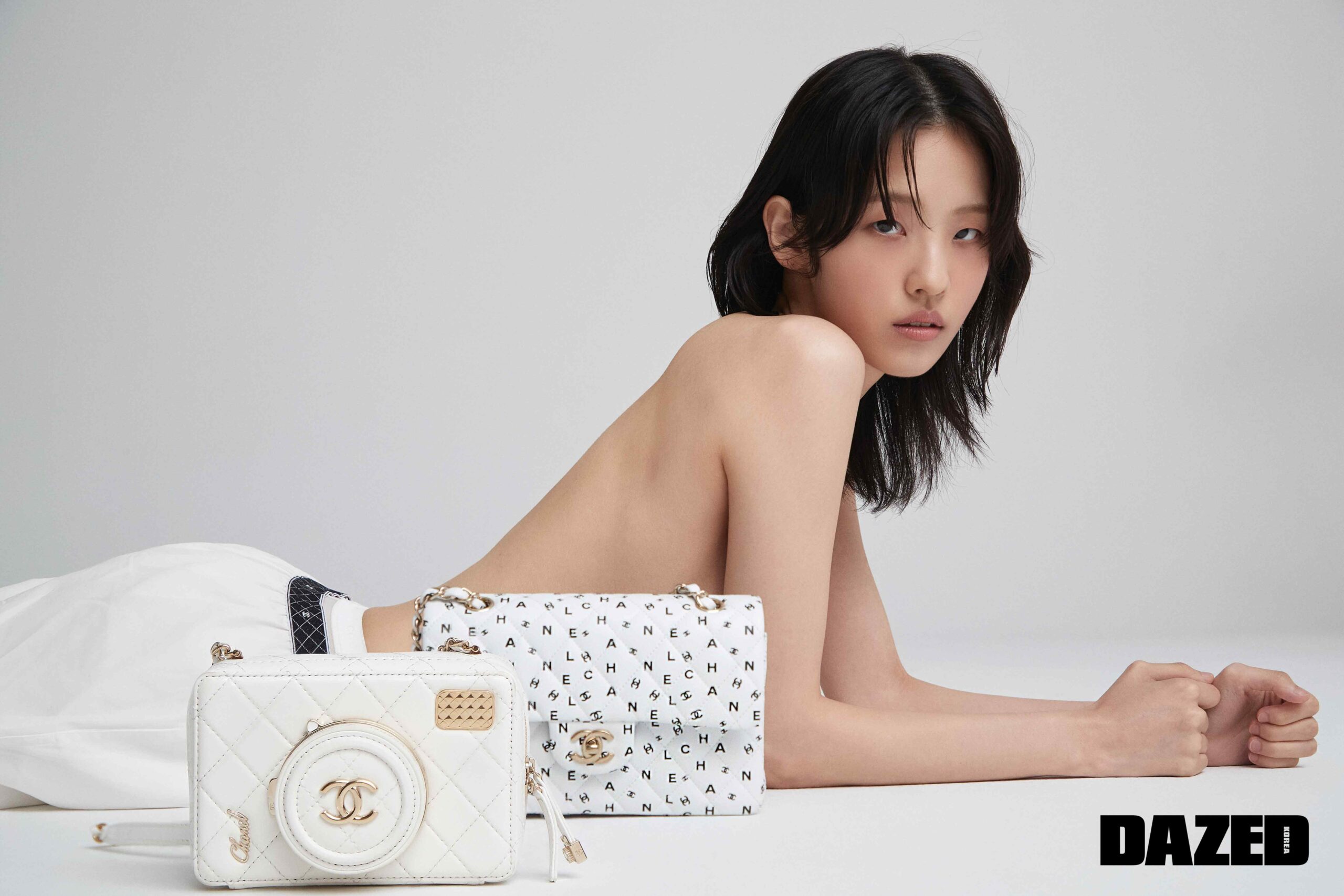 골드 메탈 카메라 백과 로고 패턴 백, 실크 오간자 블라우스, 코튼 캔버스 쇼츠, 메리제인 슈즈, 타이츠는 모두 샤넬(Chanel), 하트 클러치 백은 지미추(Jimmy Choo).