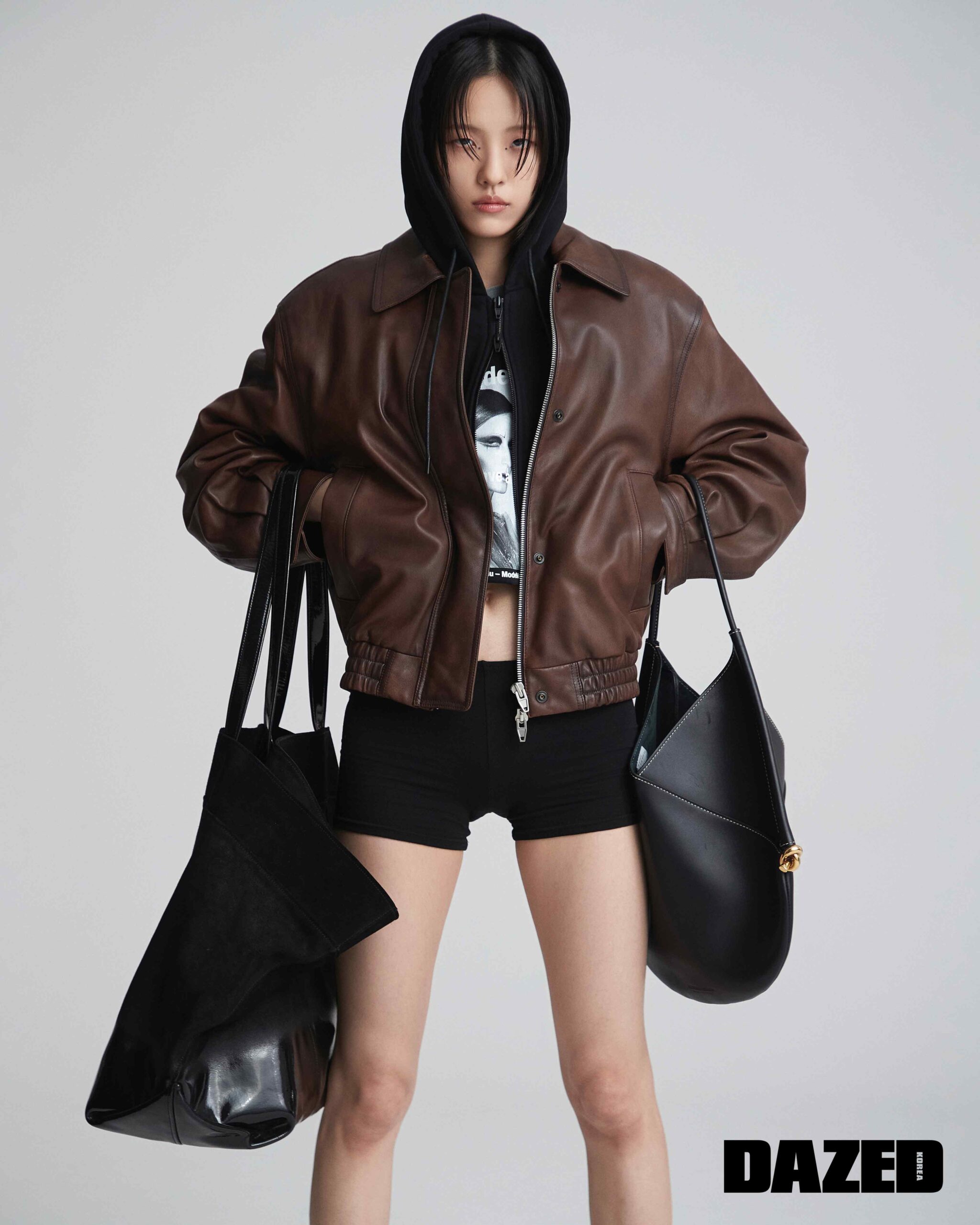 오른손에 든 스웨이드 빅 백은 아미(AMI), 왼손에 든 레더 백은 보테가 베네타(Bottega Veneta), 브라운 레더 후드 재킷은 준지(Juun.J), 톱으로 활용한 캔버스 백과 쇼츠는 에디터의 것.