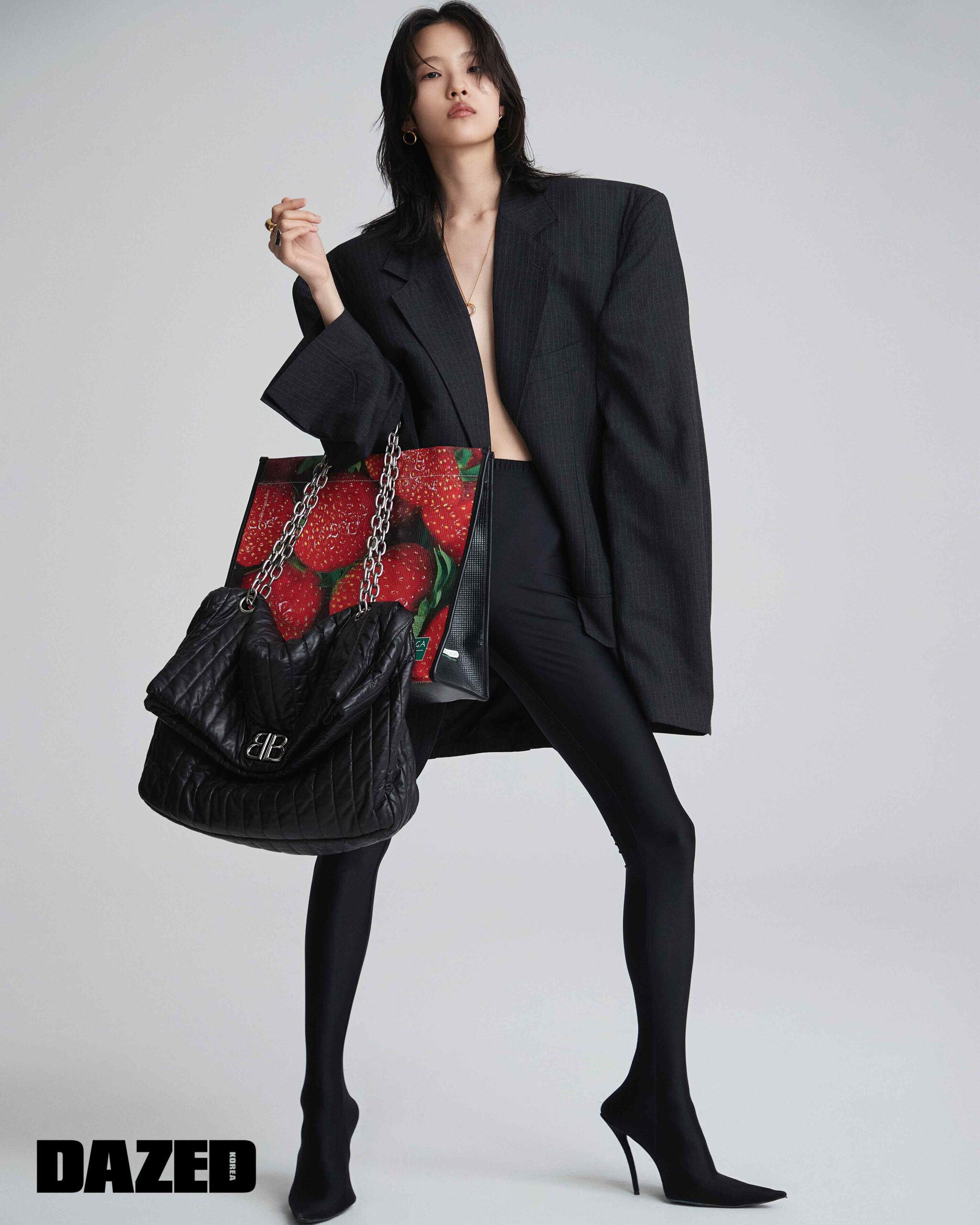 모나코 체인 엑스라지 퀼팅 체인 백과 스트로베리 프린트 메시 토트백, 컷 어웨이 박시 재킷, 팬타레깅스, 네크리스와 이어링, 골드 링, 실버 링은 모두 발렌시아가(Balenciaga).