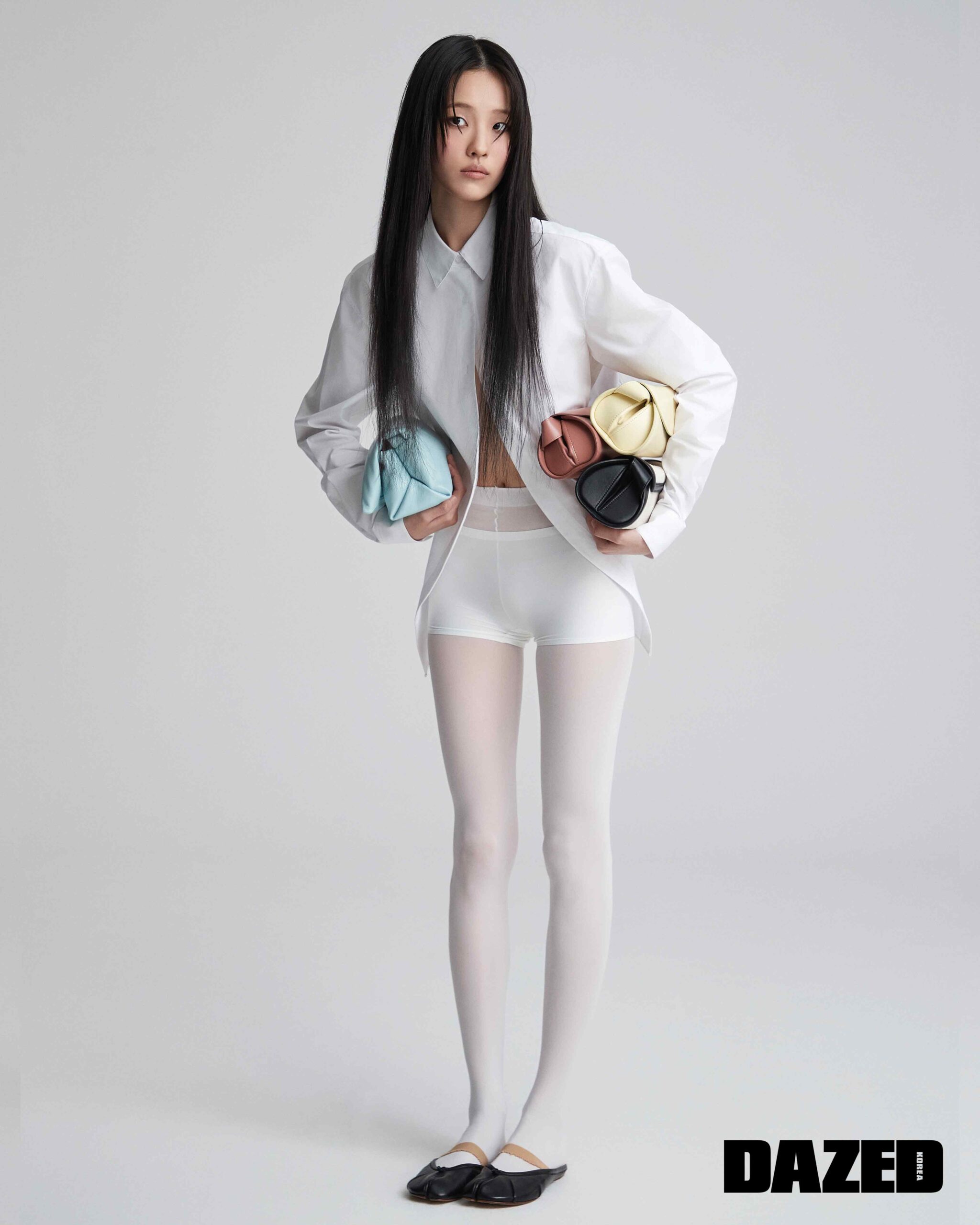 오른손에 든 프리즈마 페일 스카이 스몰 숄더백은 마르니(Marni), 왼손에 든 레몬 카놀로 백, 체리우드 카놀로 백, 캔버스 카놀로 백은 모두 질샌더(Jil Sander), 화이트 셔츠는 웰던(We11done), 타비 발레리나 뮬은 메종 마르지엘라(Maison Margiela), 타이츠와 브리프는 에디터의 것.