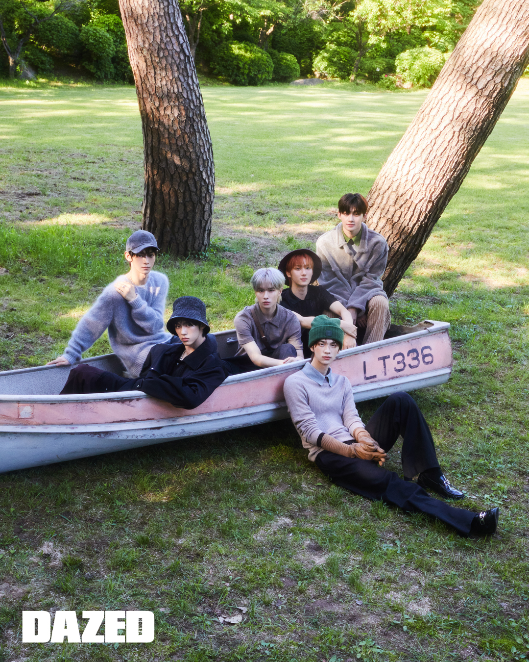 한진이 입은 그레이 모헤어 리브드 니트 톱과 캐시미어 팬츠, 코듀로이 볼캡, 골드 FF 피니싱 펜던트 네크리스, FF 모티브 와이드 밴드 링은 모두 펜디(Fendi). 도훈이 입은 코팅 코튼 필드 재킷과 버건디 캐시미어 팬츠, 블랙 FF 자카르 버킷 해트, 골드 FF 피니싱 펜던트 체인 네크리스, FF 스터드 버클 디테일의 리버서블 벨트는 모두 펜디(Fendi), 블랙 이너 톱은 에디터의 것. 경민이 입은 펜디 울 폴로 톱과 라이트 그레이 캐시미어 팬츠, FF 디테일의 토스트 모티브 백은 펜디(Fendi). 영재가 입은 스파클 울 폴로 톱과 스웨이드 블랙 데님 팬츠, 버건디 FF 모티브 버킷 해트는 모두 펜디(Fendi). 지훈이 입은 그레이 시어링 재킷과 컬러 레이어링이 특징인 니트 톱, 카프 레더 팬츠는 모두 펜디(Fendi). 신유가 입은 컬러 레이어링이 특징인 니트 톱과 펜디 스티치 패턴 팬츠, 펜디 오’락 로퍼, FF 로고 포인트 비니, 팔라듐 FF 로고 글러브는 모두 펜디(Fendi), 삭스는 에디터의 것.