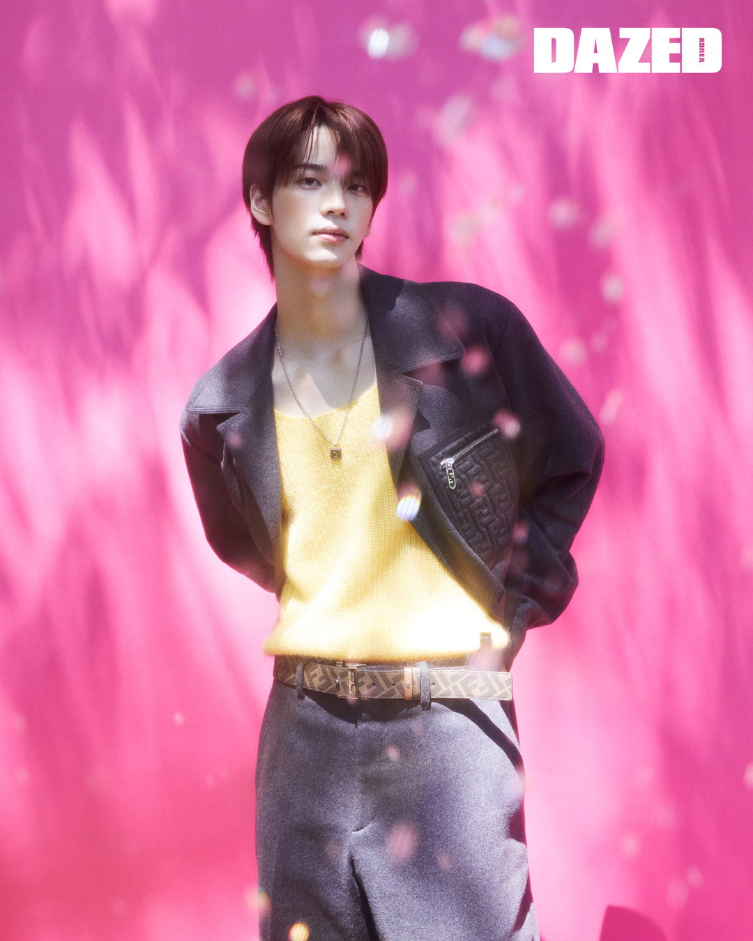 FF 체스트 포켓 싱글브레스트 캐시미어 코트와 옐로 모헤어 니트 톱, 라이트 그레이 캐시미어 팬츠, 골드 FF 피니싱 펜던트 네크리스, FF 스터드 버클 디테일의 리버서블 벨트는 모두 펜디(Fendi).