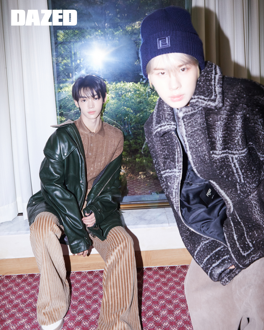 한진이 입은 레더 재킷과 스파클 울 폴로 톱, 카프 레더 팬츠, 펜디 레터링 솔이 특징인 펜디 매치 스니커즈는 모두 펜디(Fendi). 경민이 입은 메리노 시어링 재킷과 펜디 스파클 울 폴로 톱, 카프 레더 버뮤다팬츠, FF 로고 포인트 비니는 모두 펜디(Fendi).